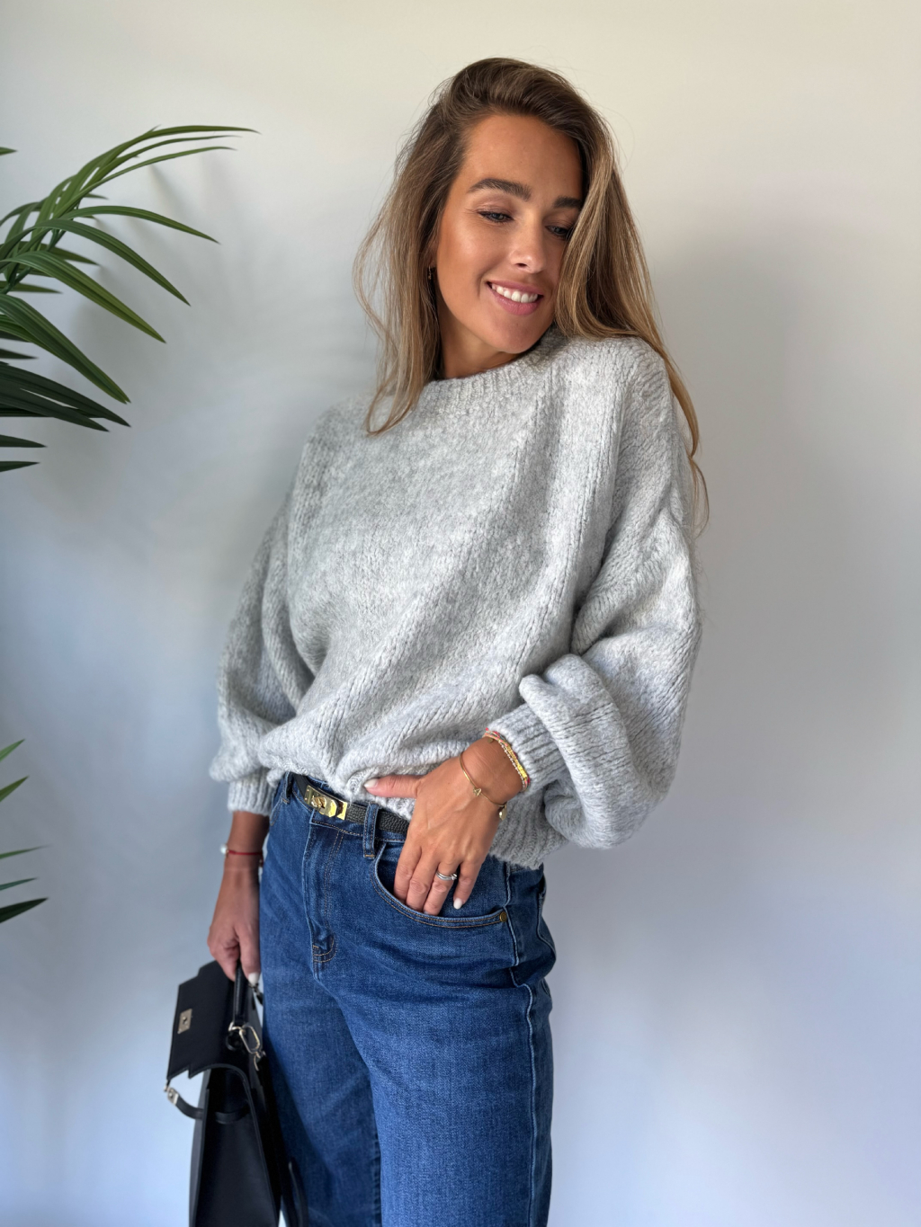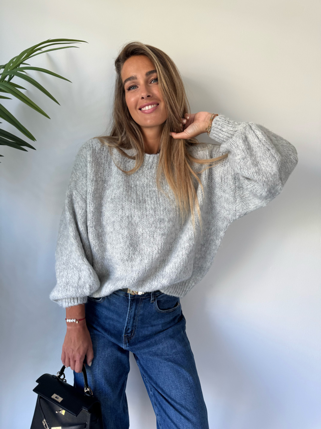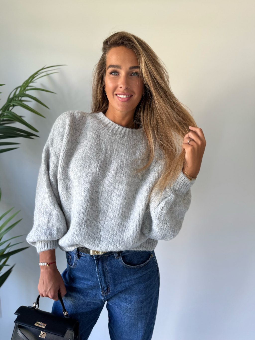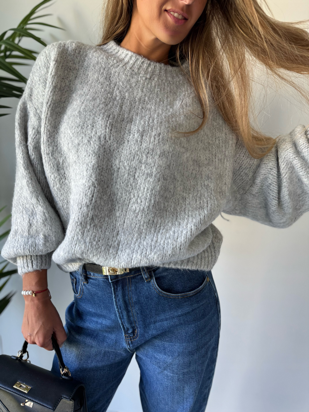 Krásný, fialový svetr s kulatým výstřihem a dlouhými rukávy, které jsou zakončeny náplety do gumičky. Svetr je zakončen žebrovaným lemem.