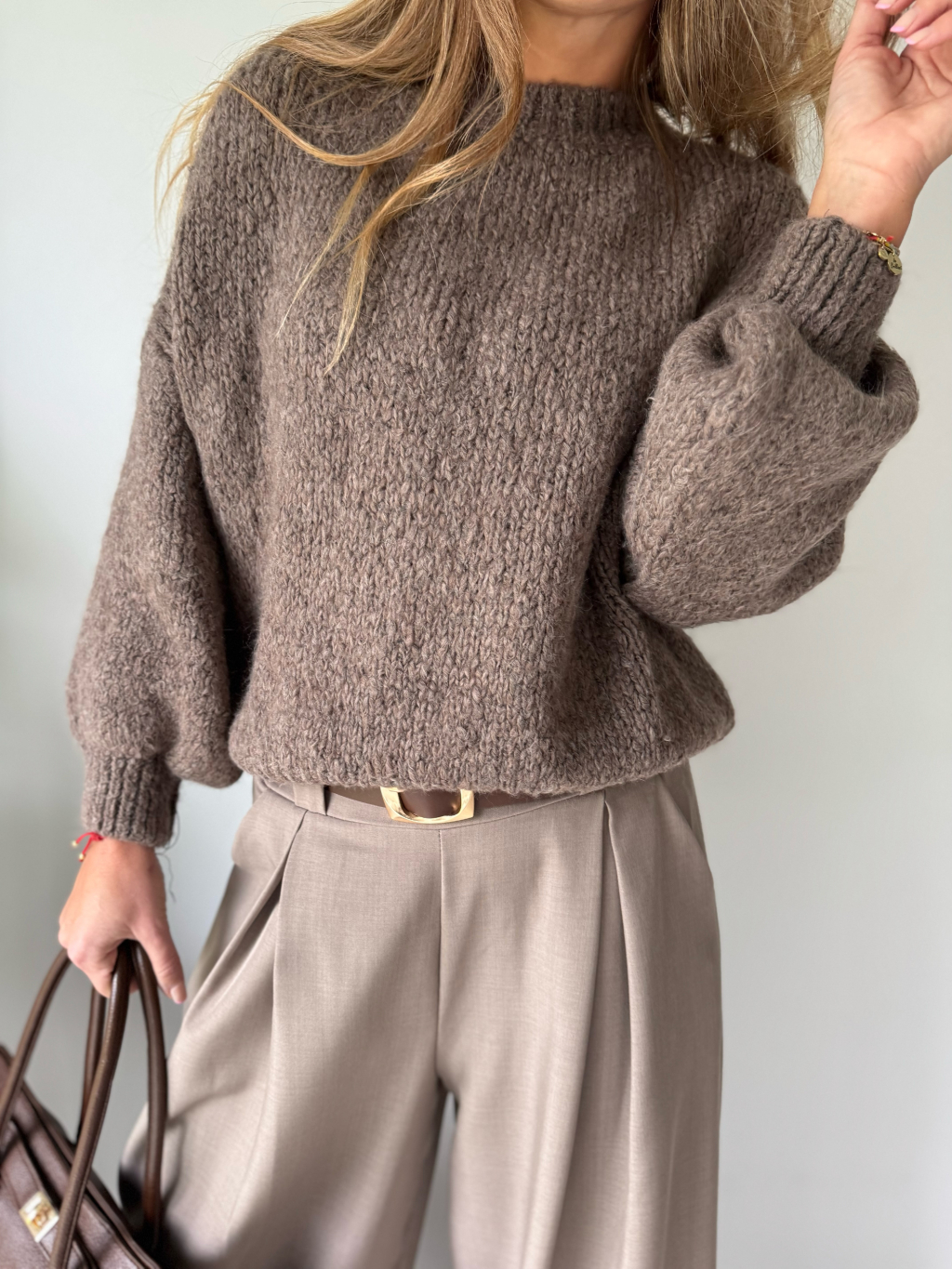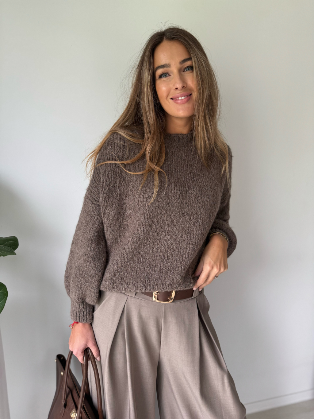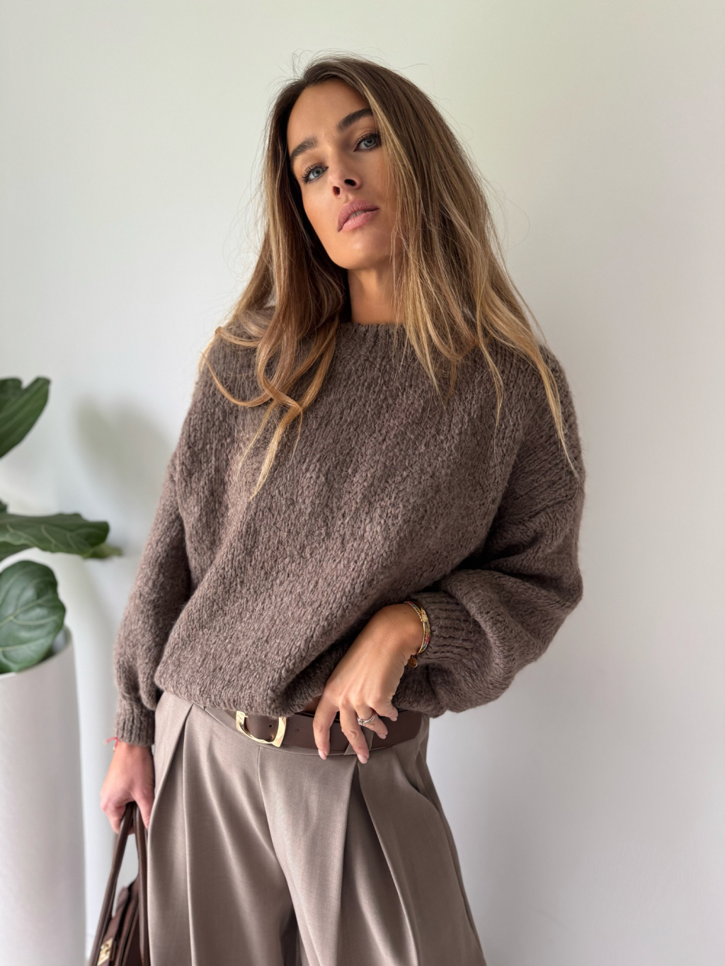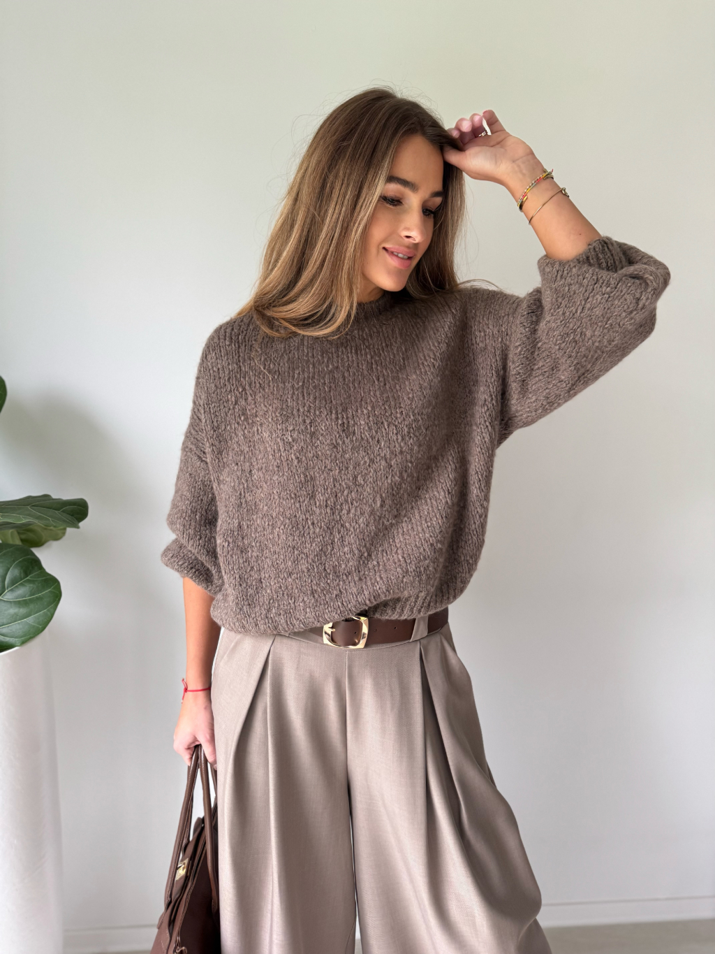 Krásný, fialový svetr s kulatým výstřihem a dlouhými rukávy, které jsou zakončeny náplety do gumičky. Svetr je zakončen žebrovaným lemem.