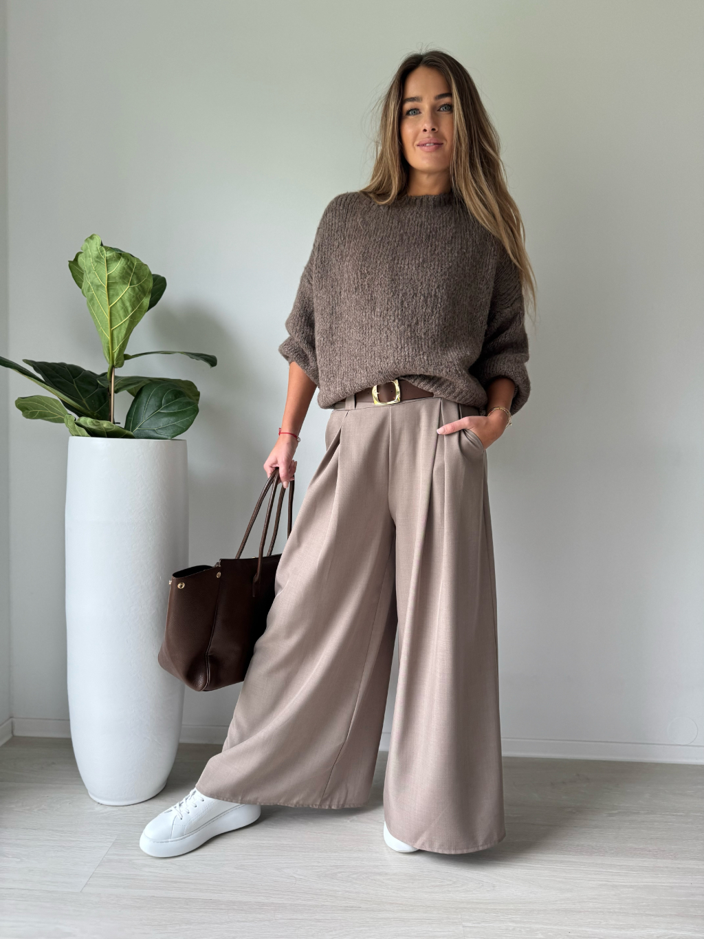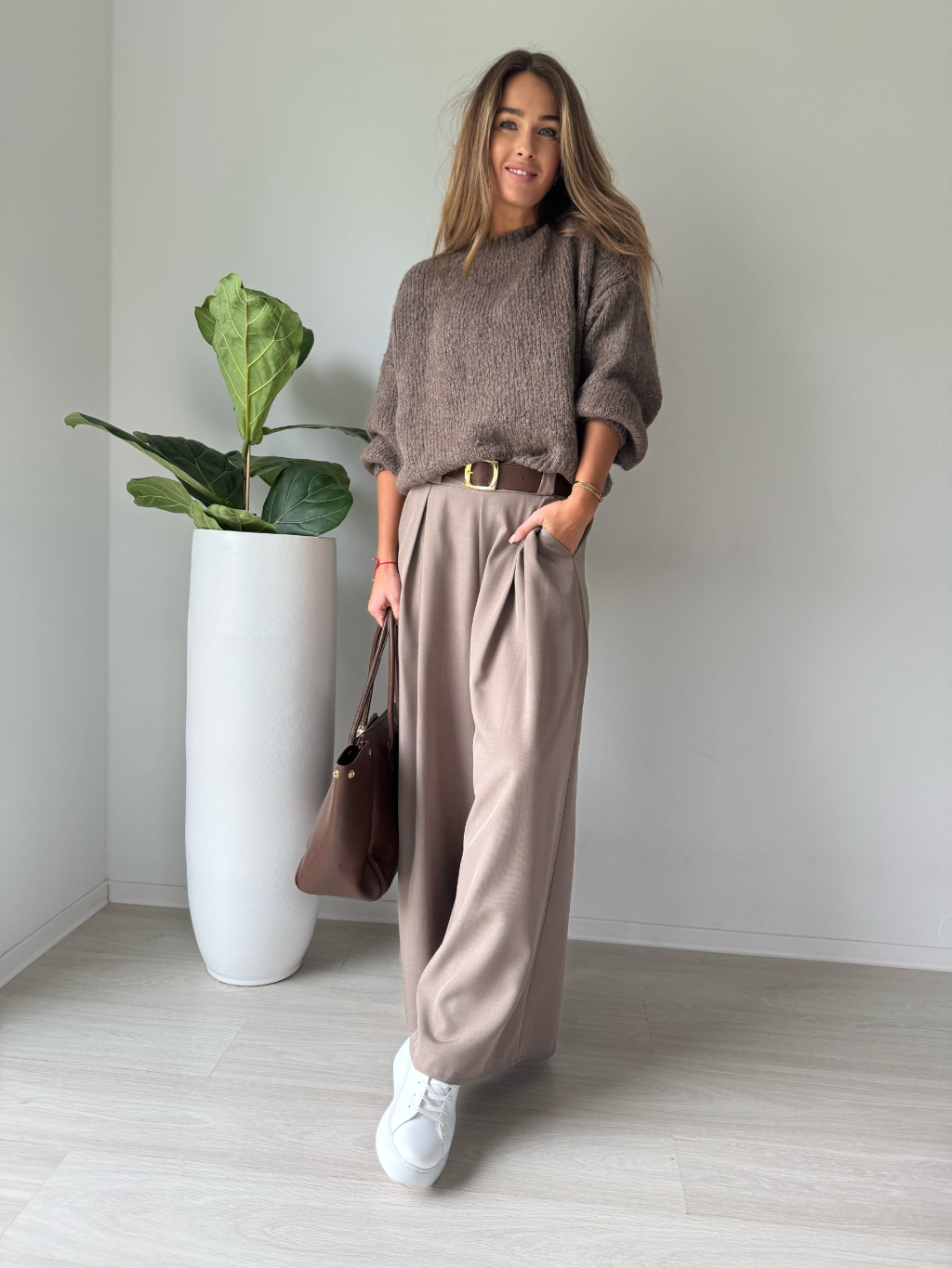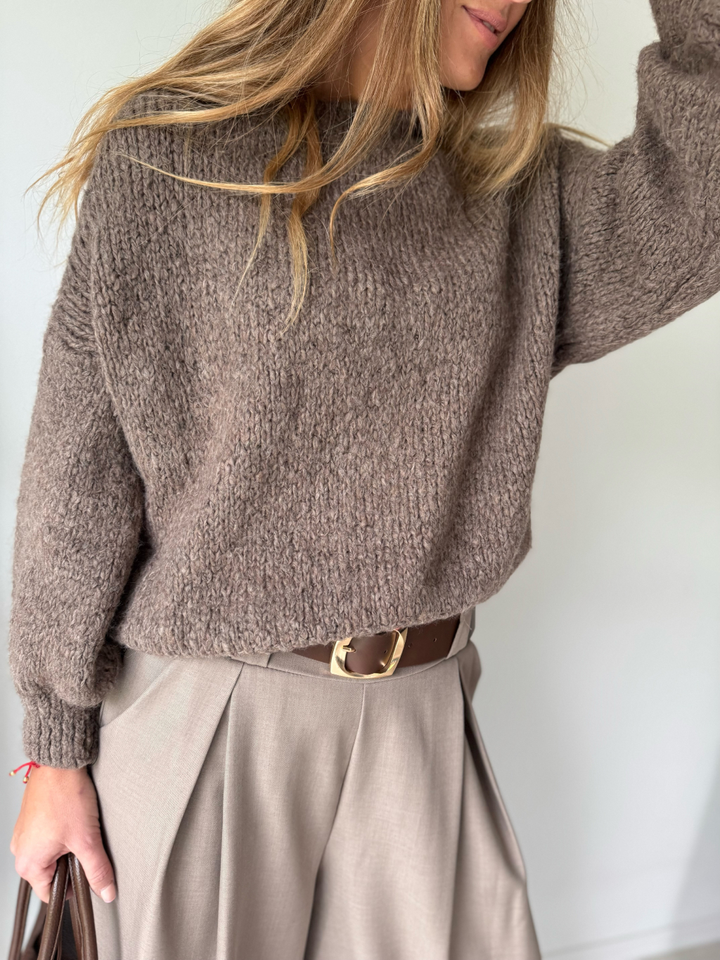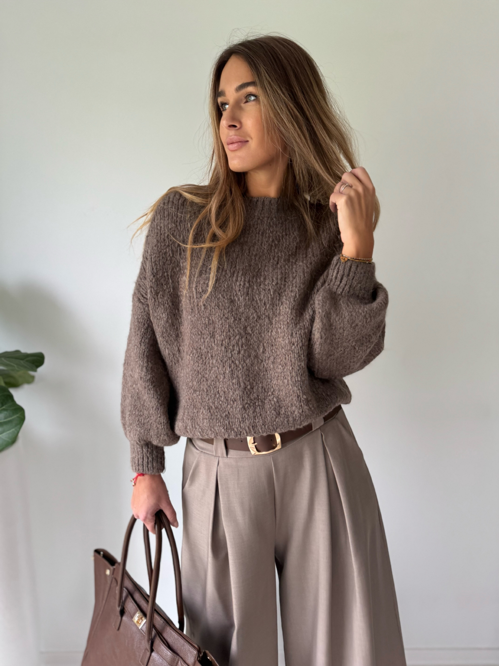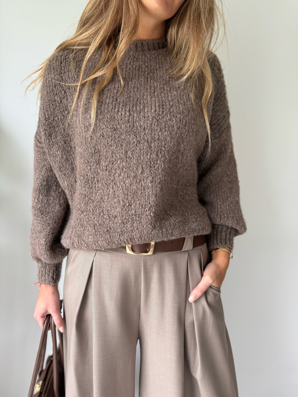 Krásný, fialový svetr s kulatým výstřihem a dlouhými rukávy, které jsou zakončeny náplety do gumičky. Svetr je zakončen žebrovaným lemem.