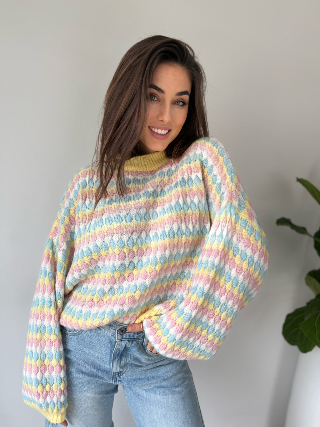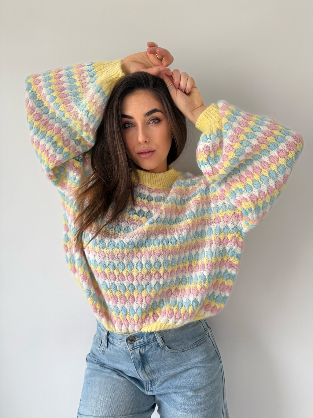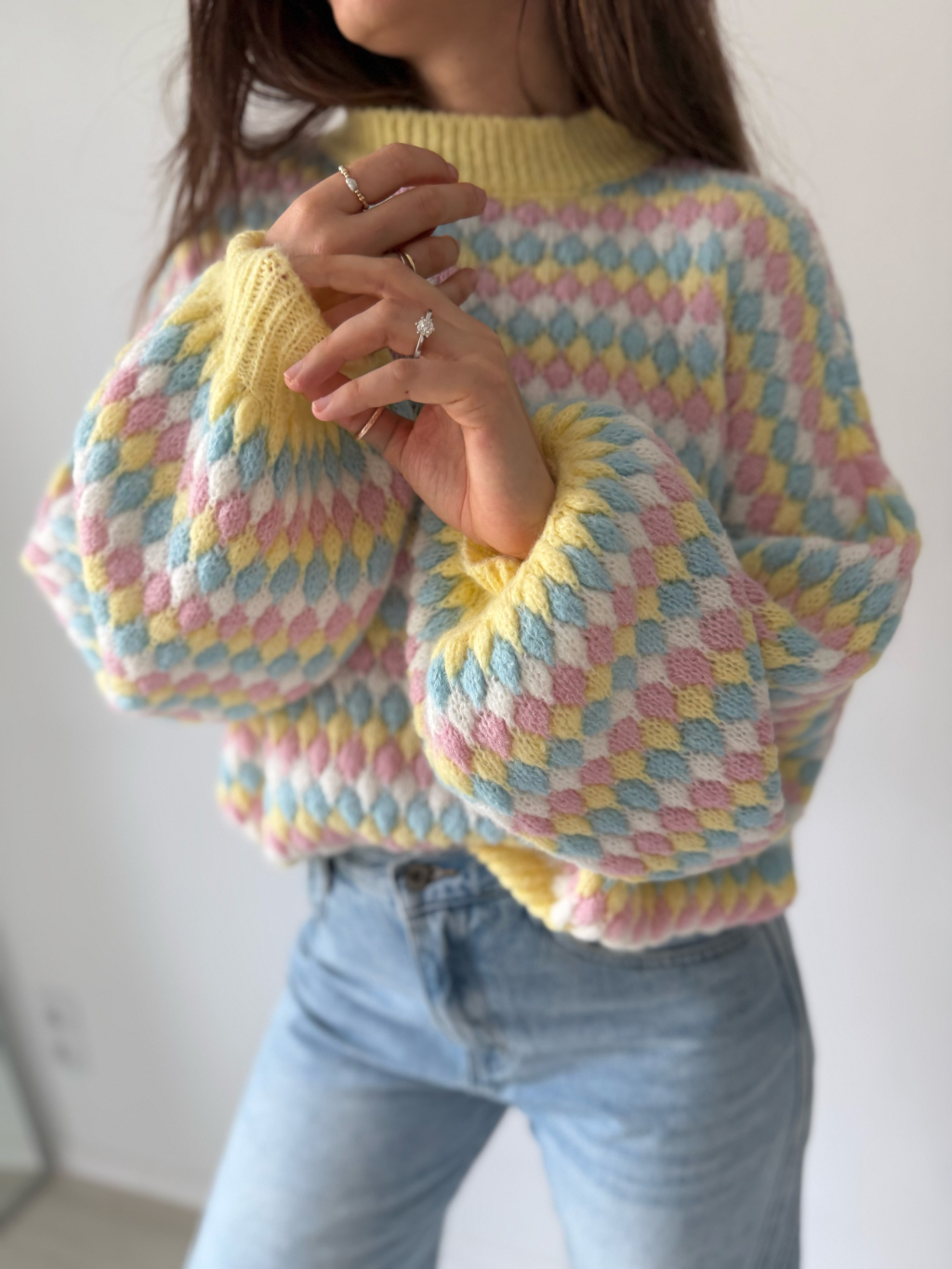 barevný svetr, volný svetr, pletený svetr, svetr mix barev, žlutý svetr