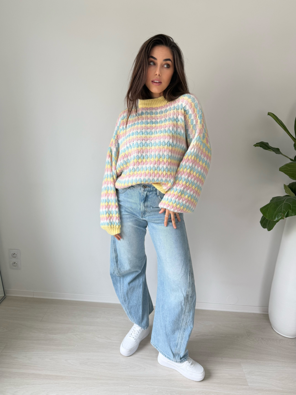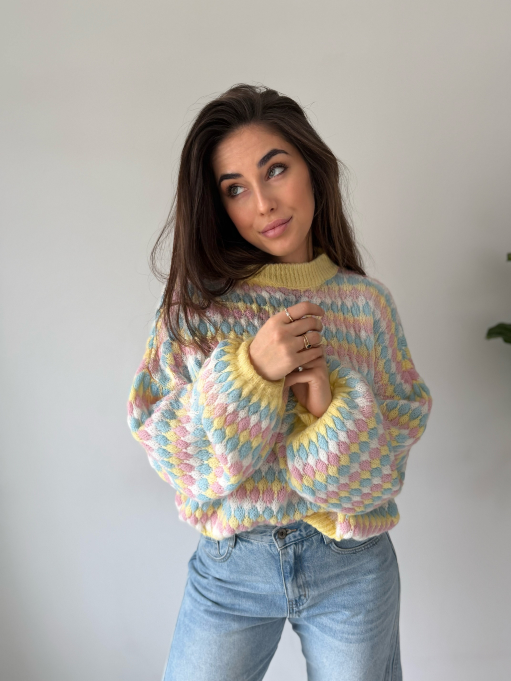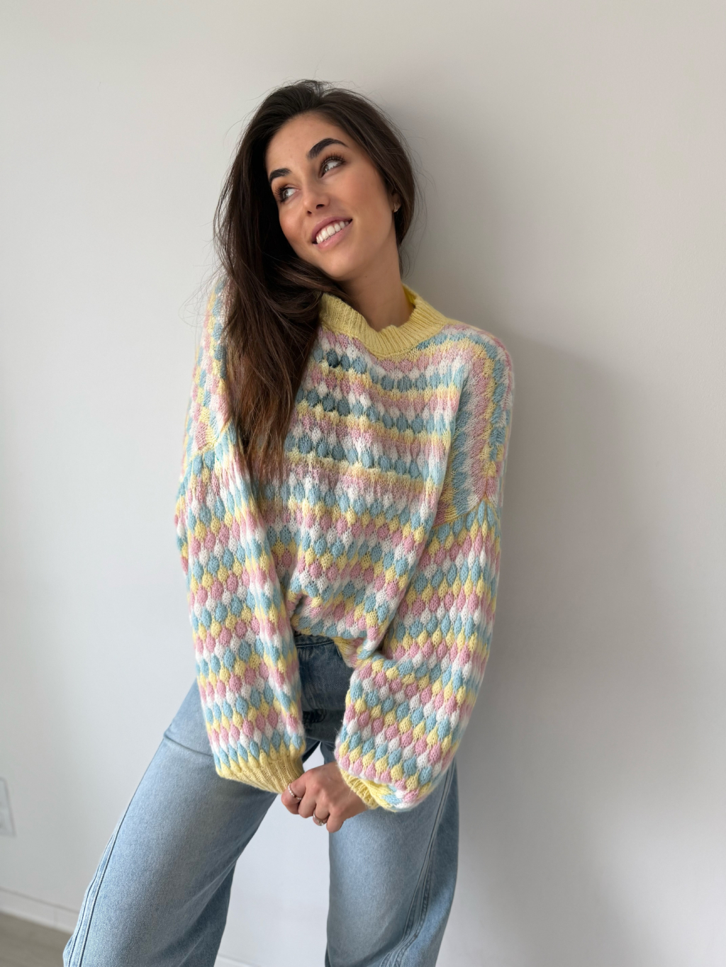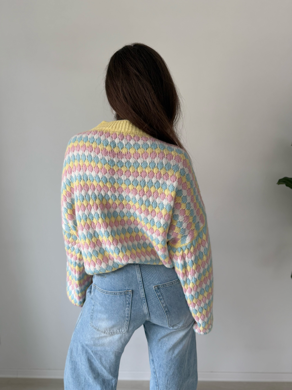 barevný svetr, volný svetr, pletený svetr, svetr mix barev, žlutý svetr