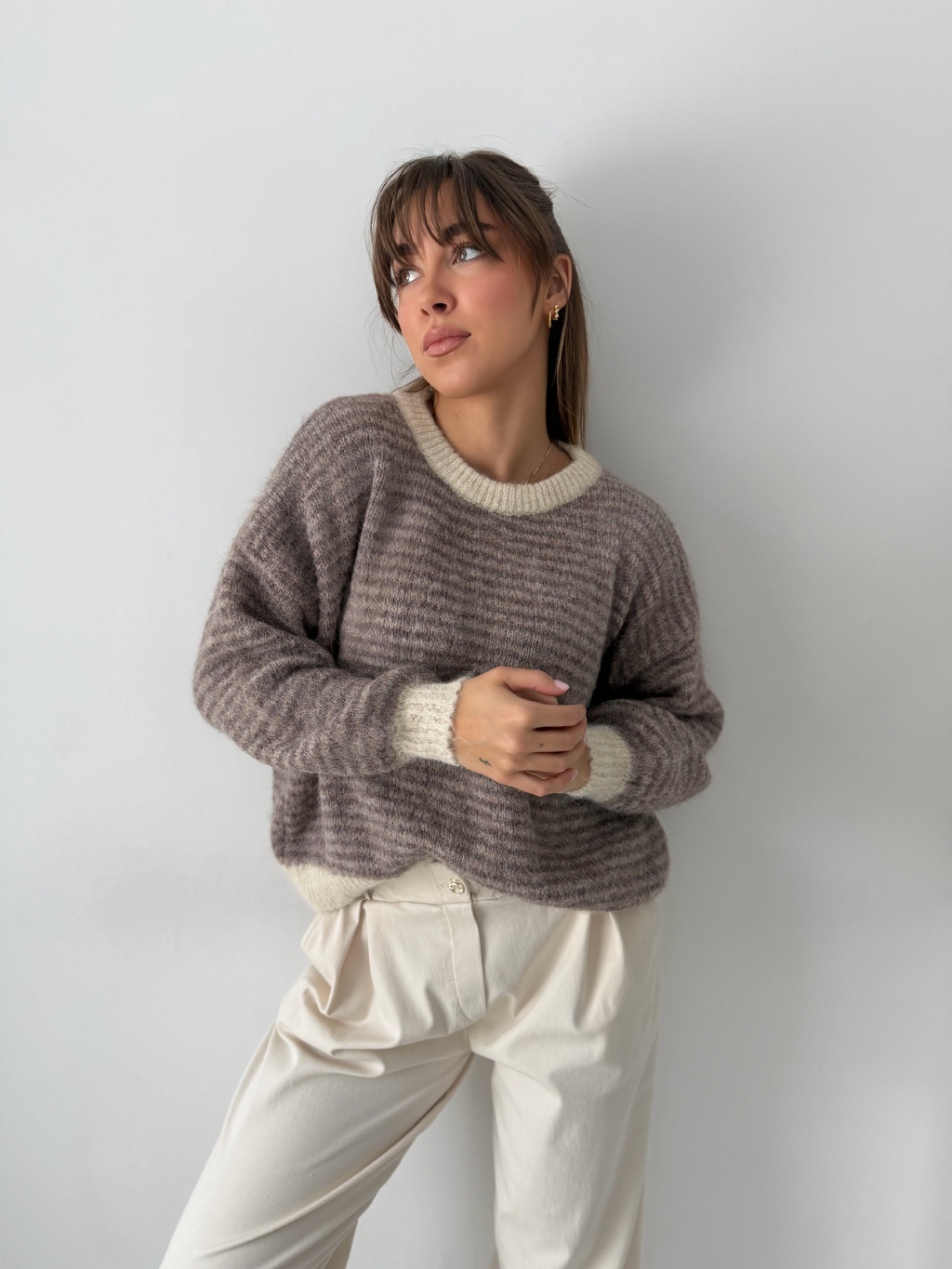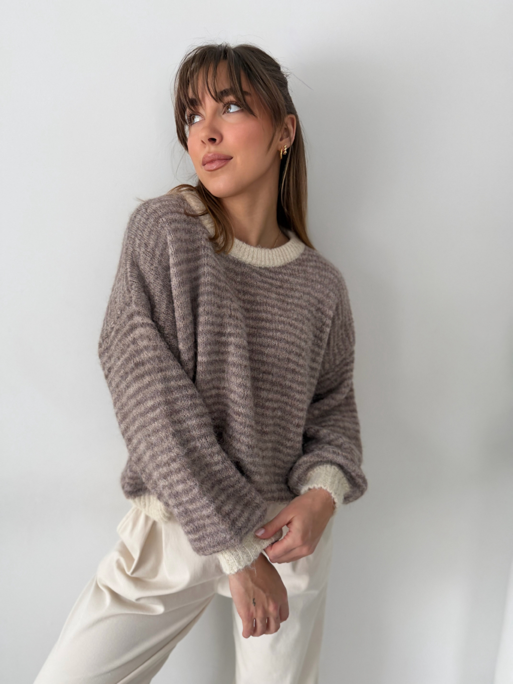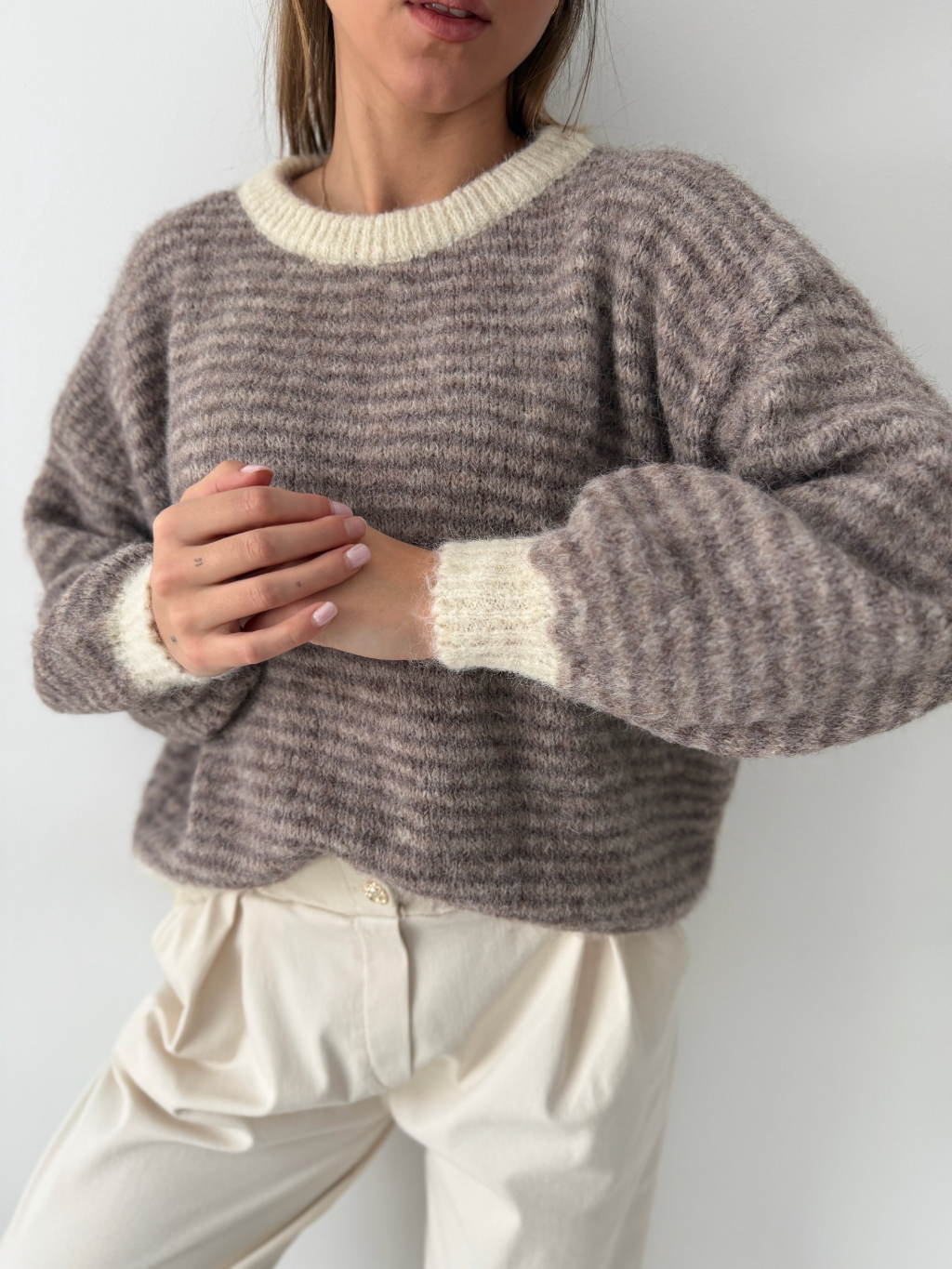 Svetr pruhovaný. Béžový uplet po okrajích.