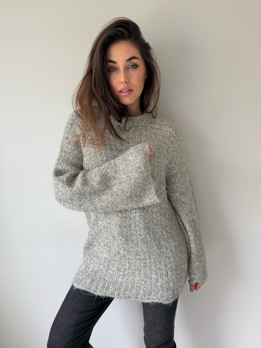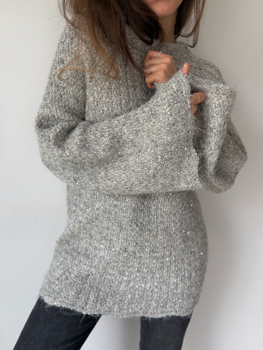 Volný svetr s flitry. Kolem krku se zavazuje mašlí. Rukávy volné.