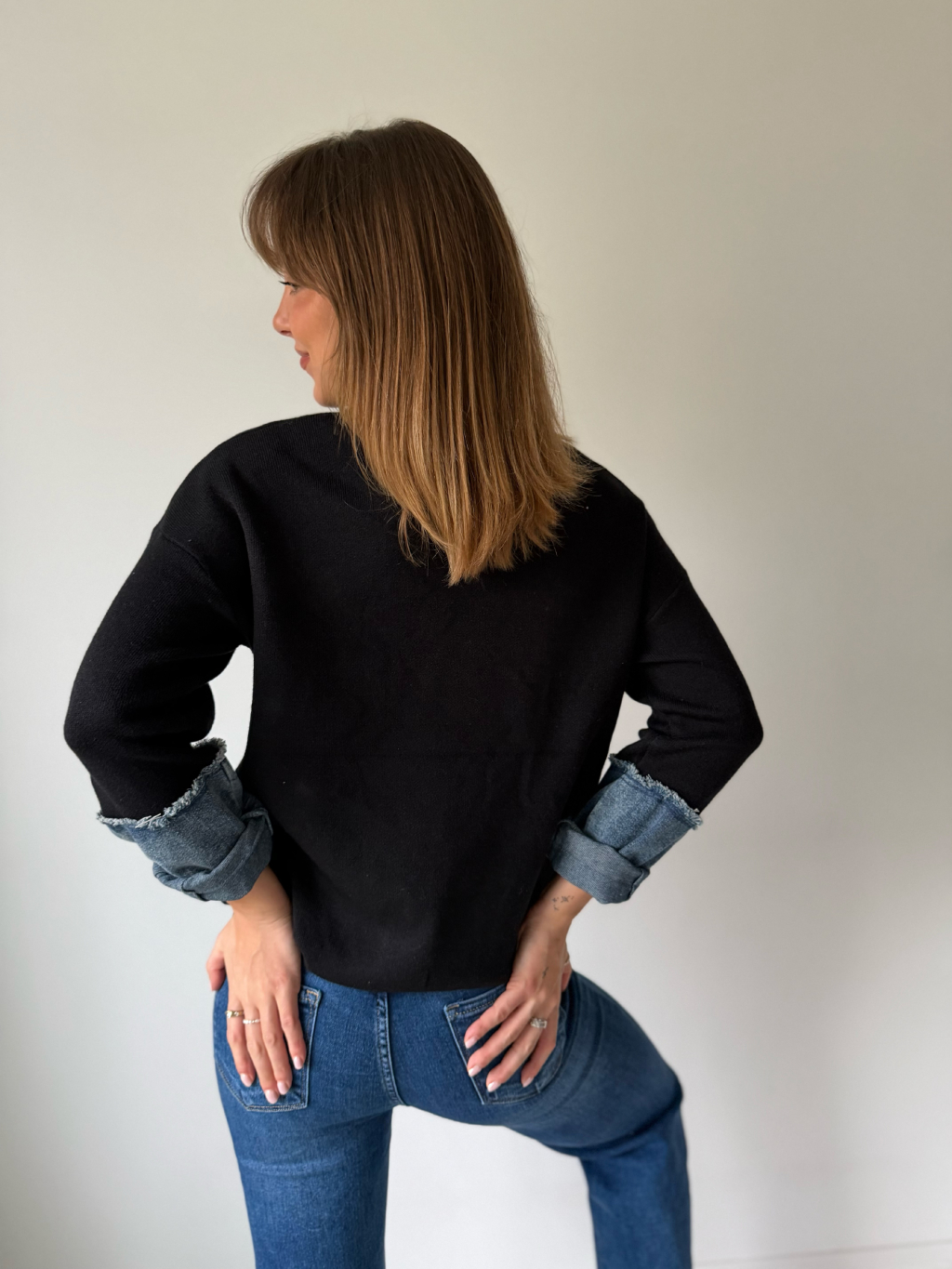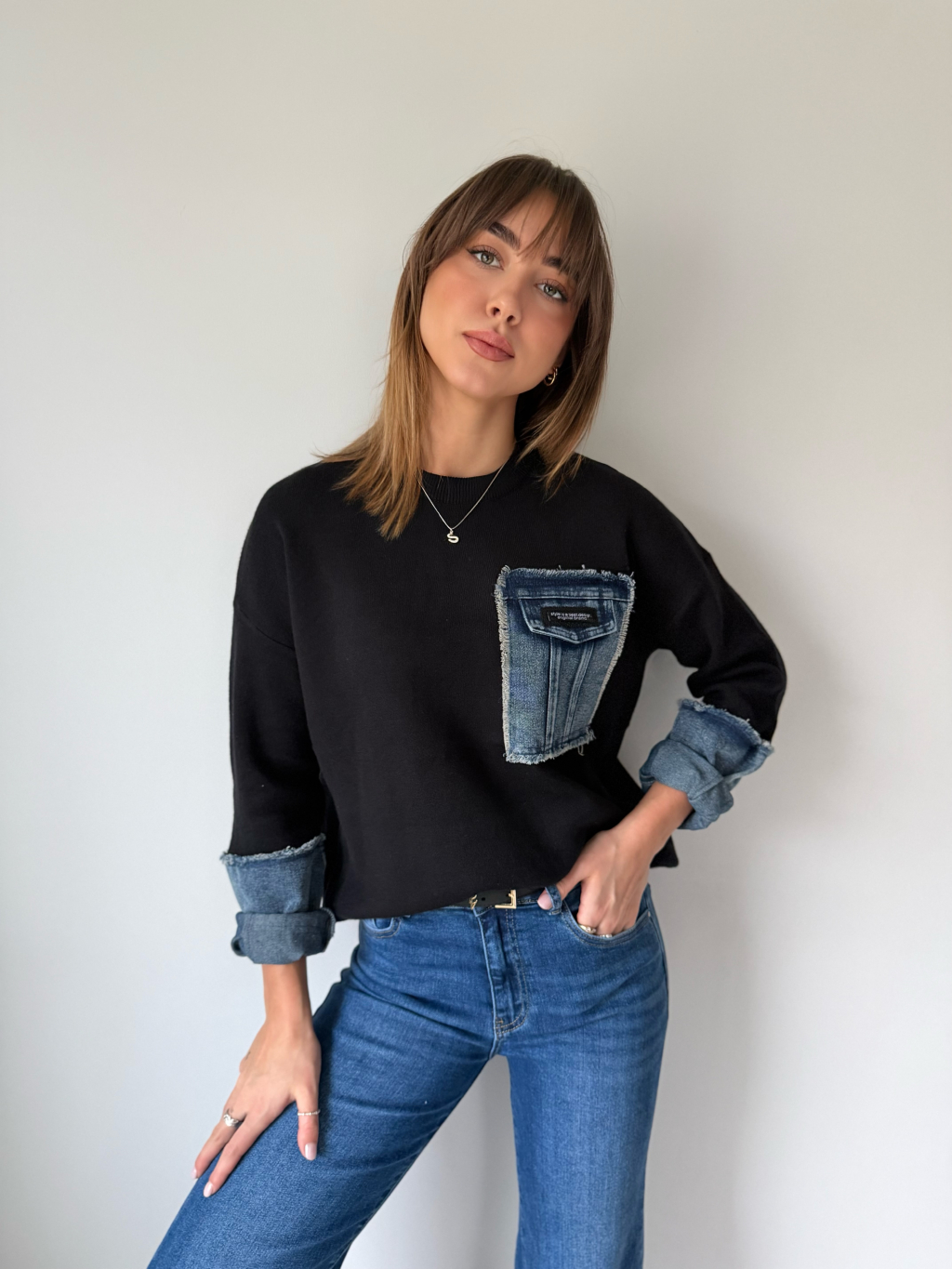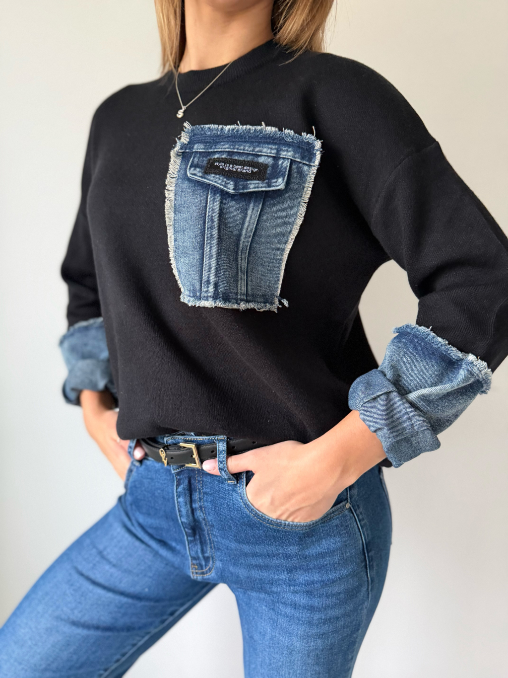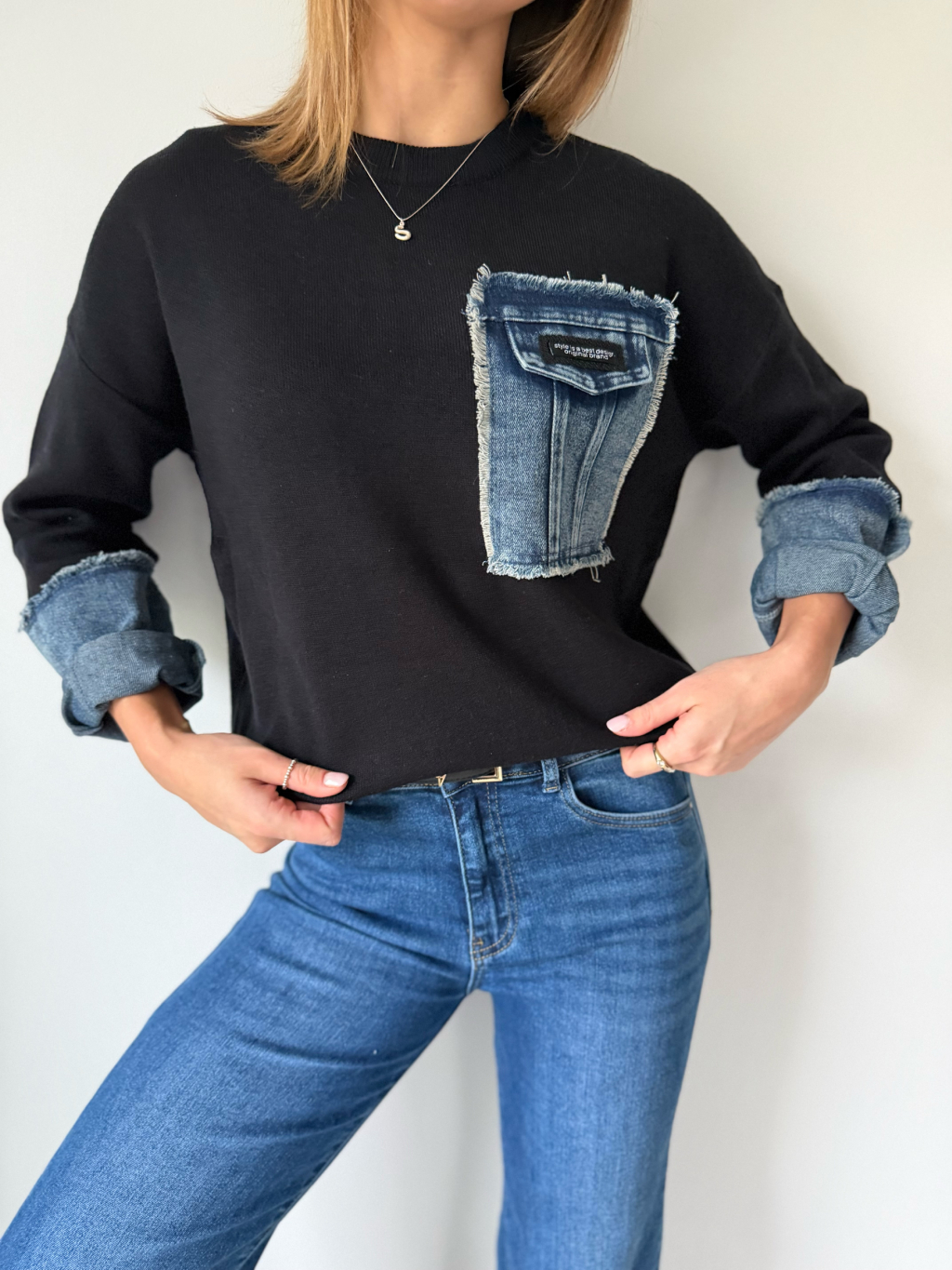 Svetr z příjemného materiálu. Kraje rukávů a falešná náprsní kapsa jsou z riflového materiálu.