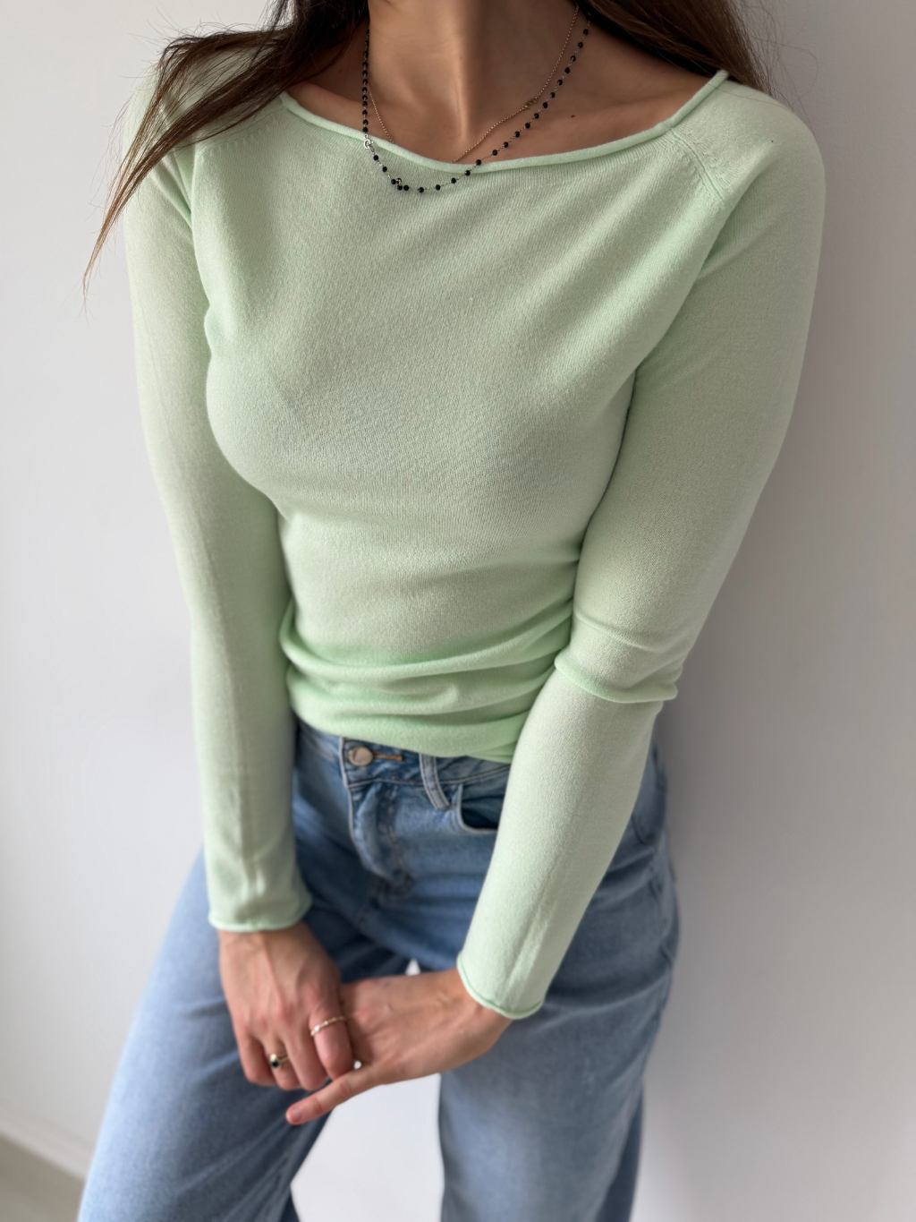 Lehký svetřík s dlouhým rukávem, nebo také jako triko. Ohrnuté lemy. Široký výstřih. Decentní prošívání od paží ke krku.