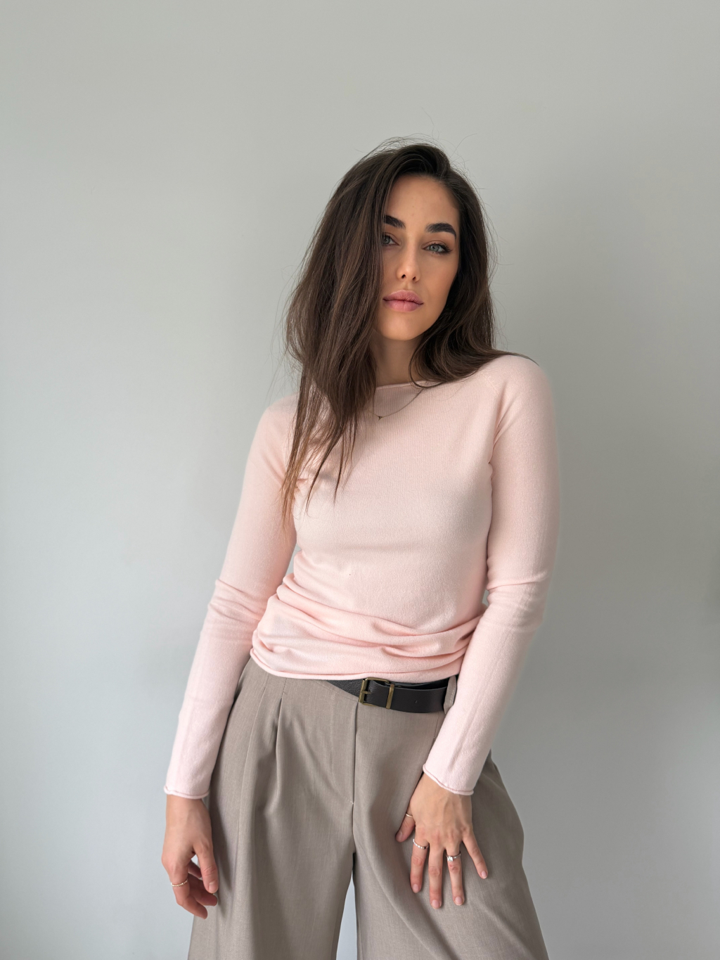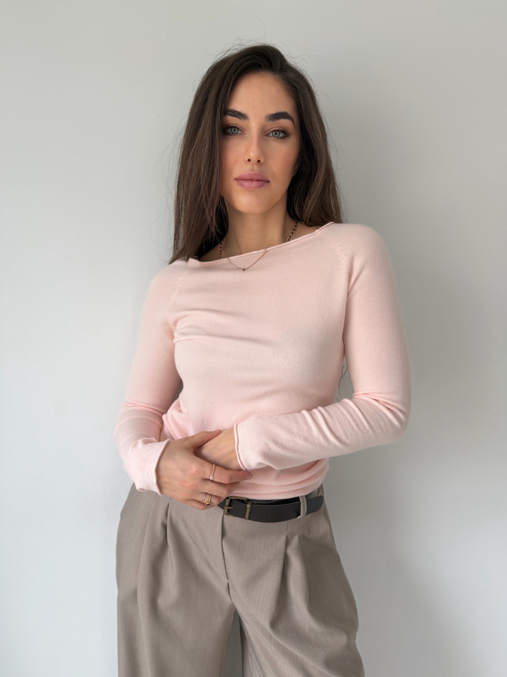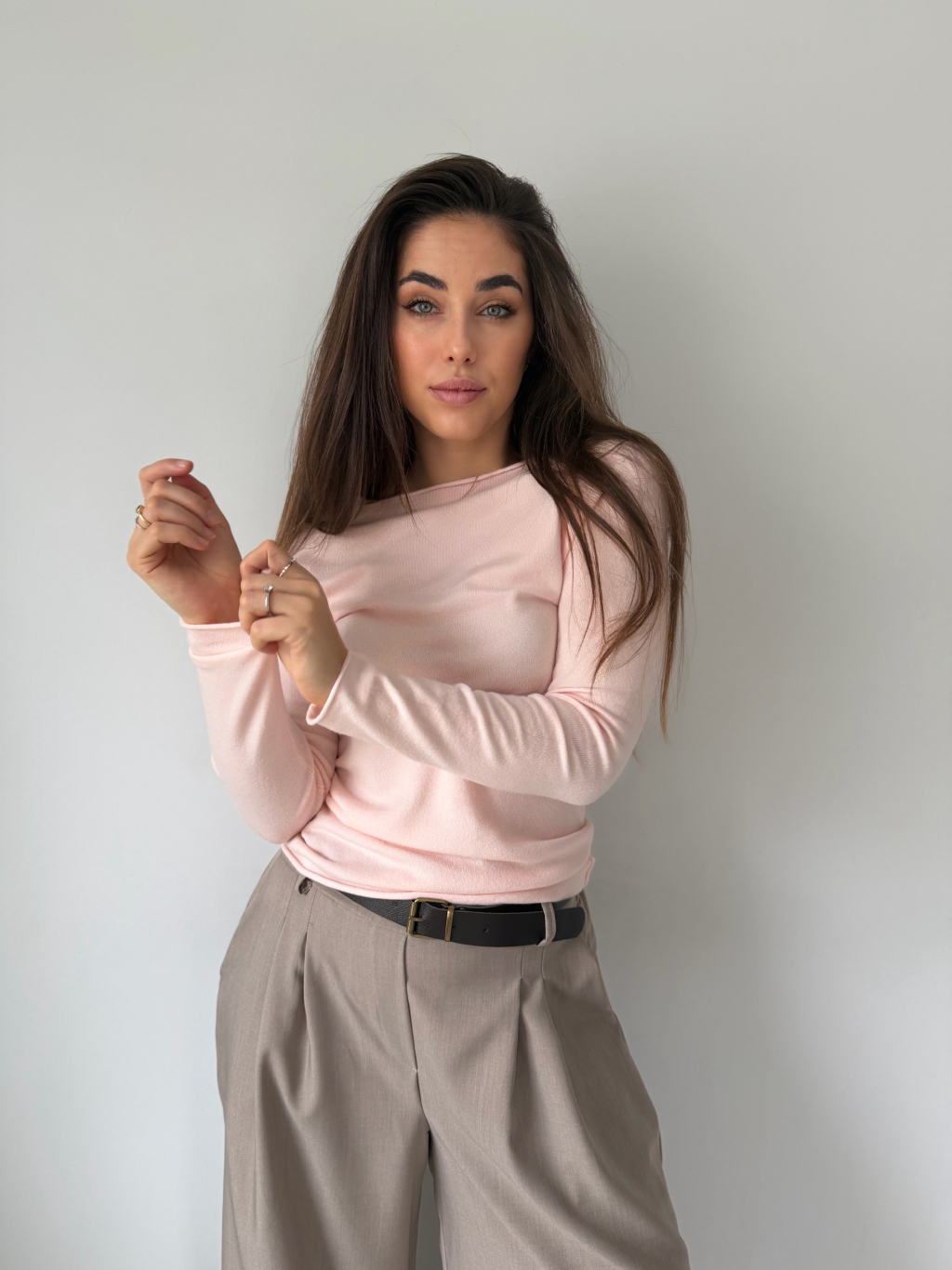 Lehký svetřík s dlouhým rukávem, nebo také jako triko. Ohrnuté lemy. Široký výstřih. Decentní prošívání od paží ke krku.