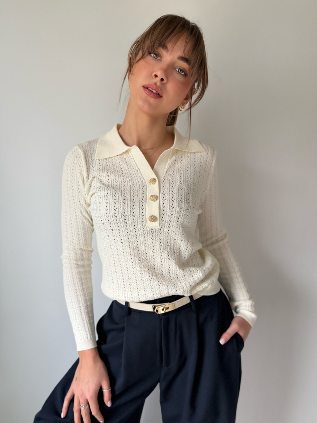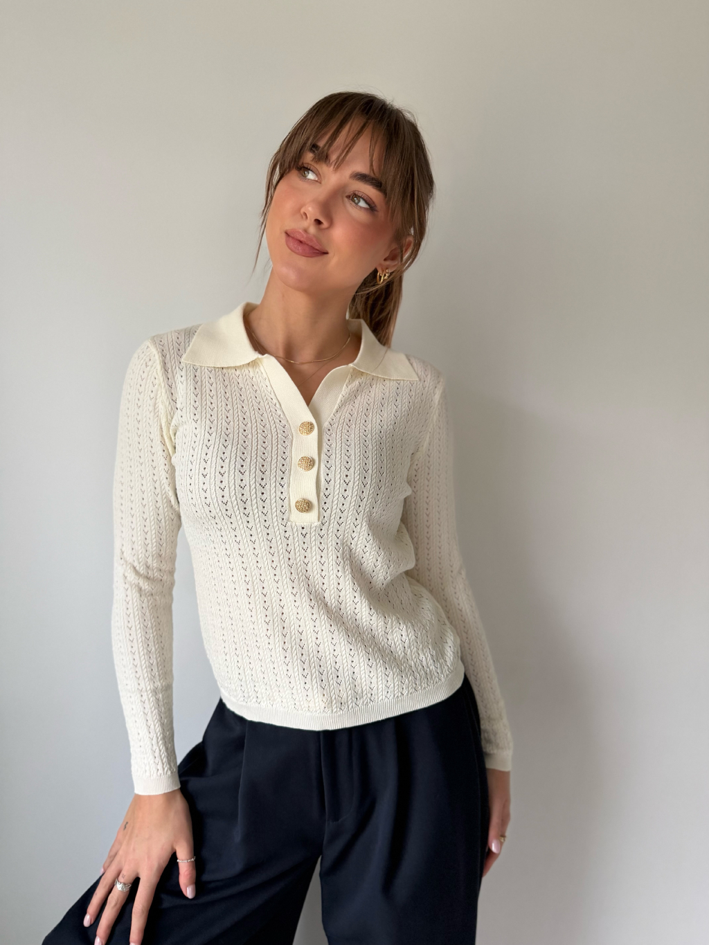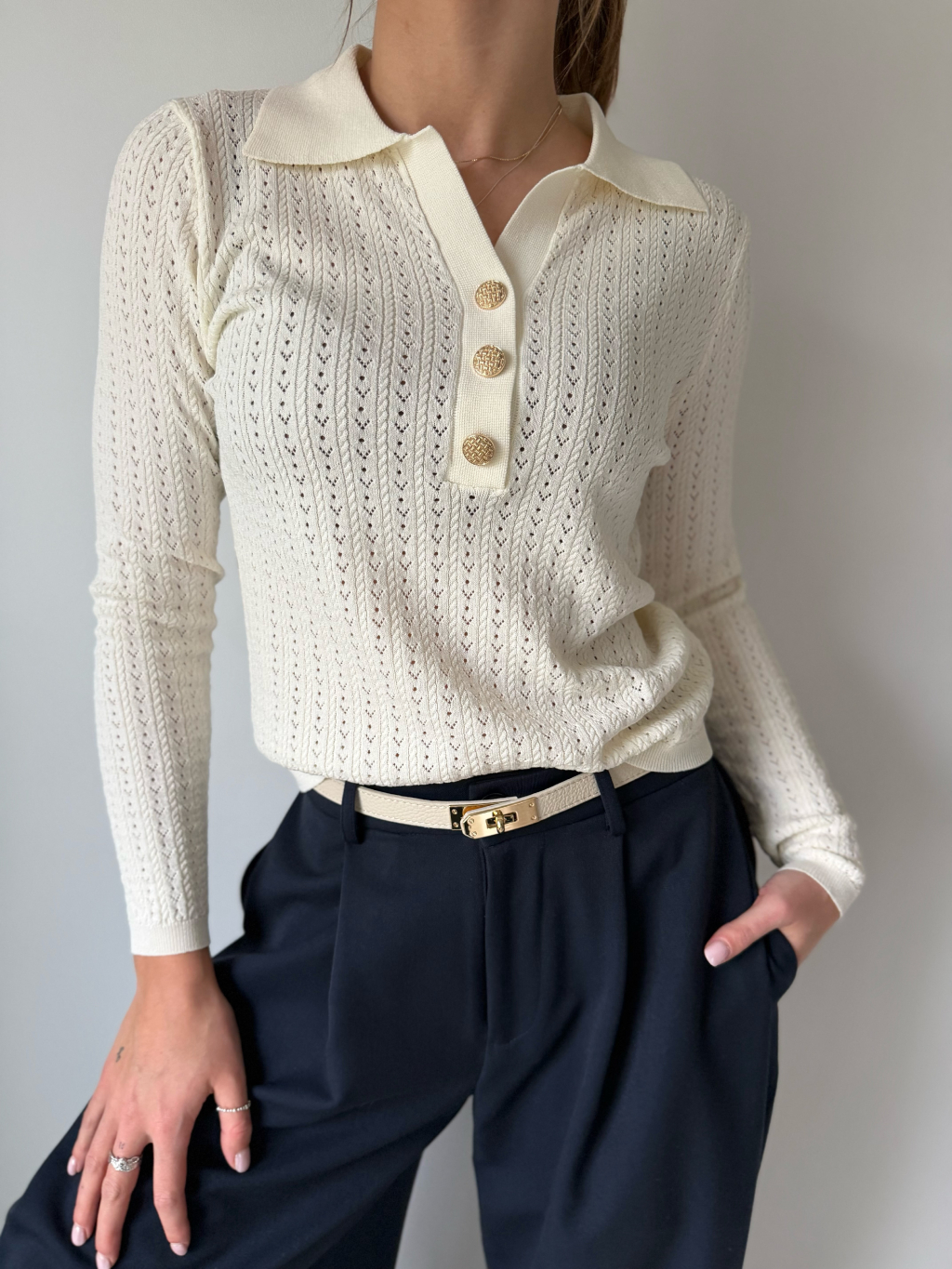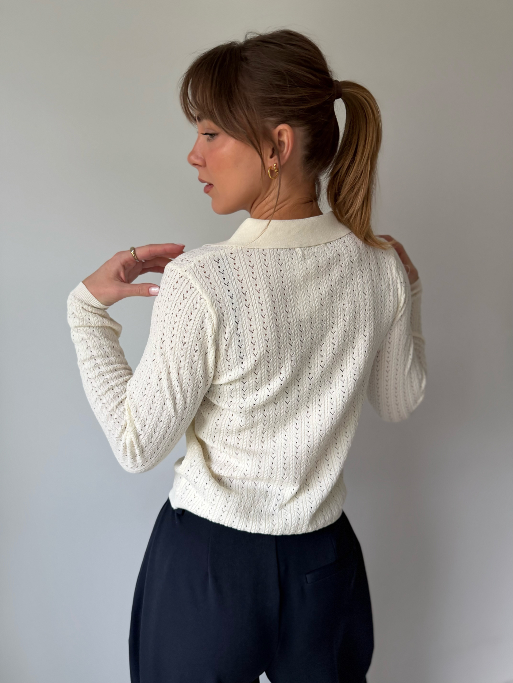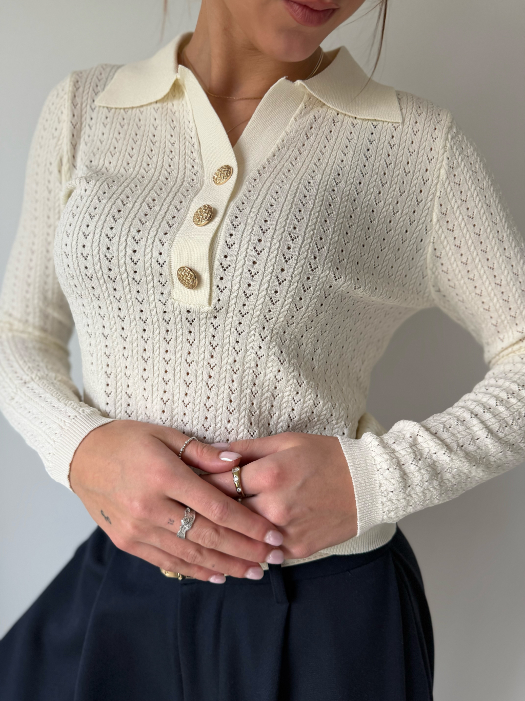 Lehký jarní svetřík s límečkem. Dírkovaný vzor. Zapínání na zdobené knoflíky.