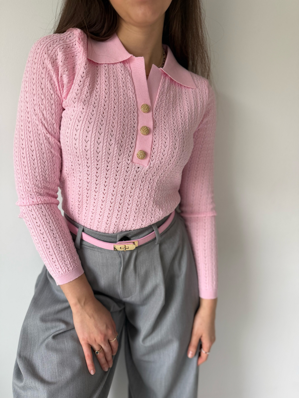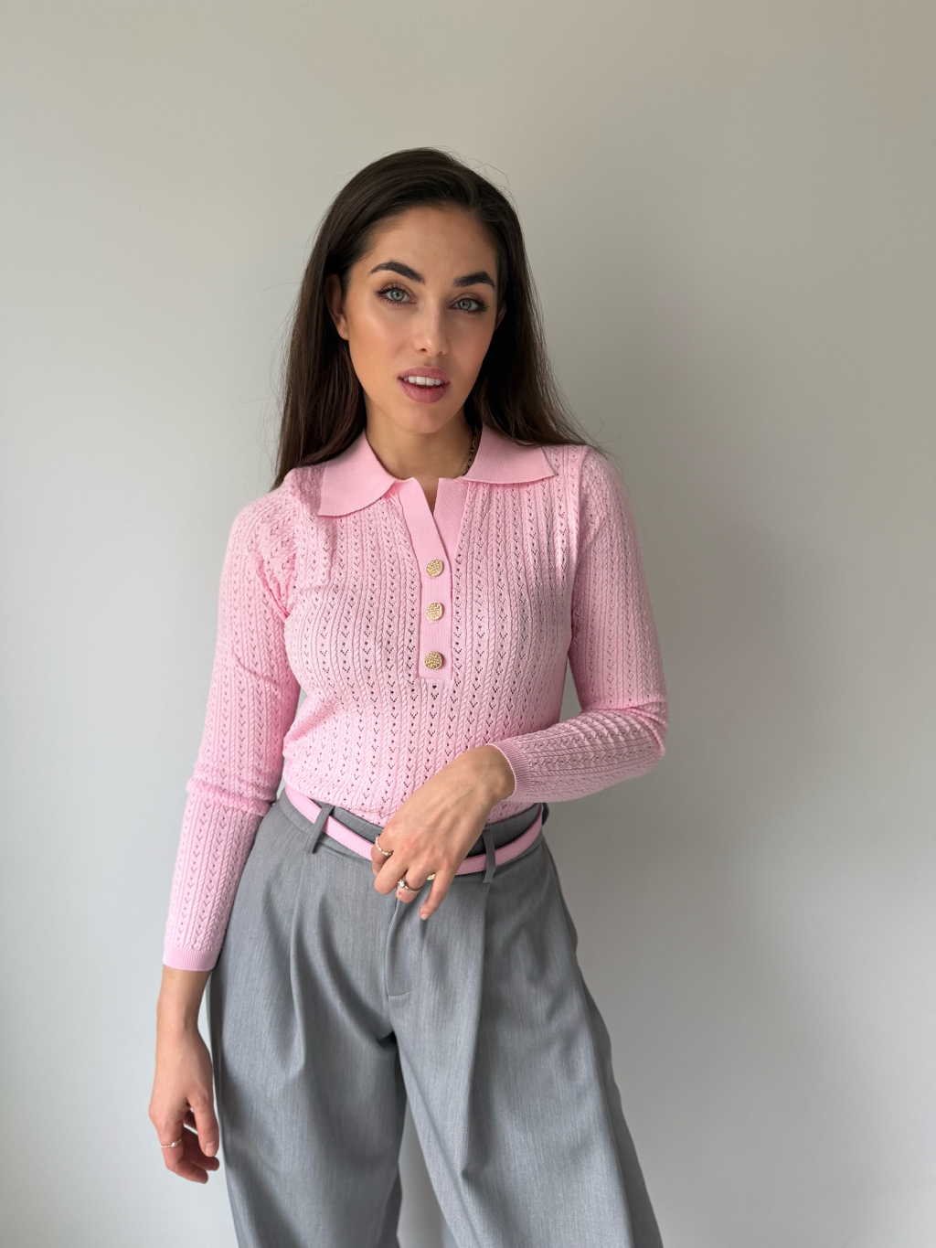 Lehký jarní svetřík s límečkem. Dírkovaný vzor. Zapínání na zdobené knoflíky.