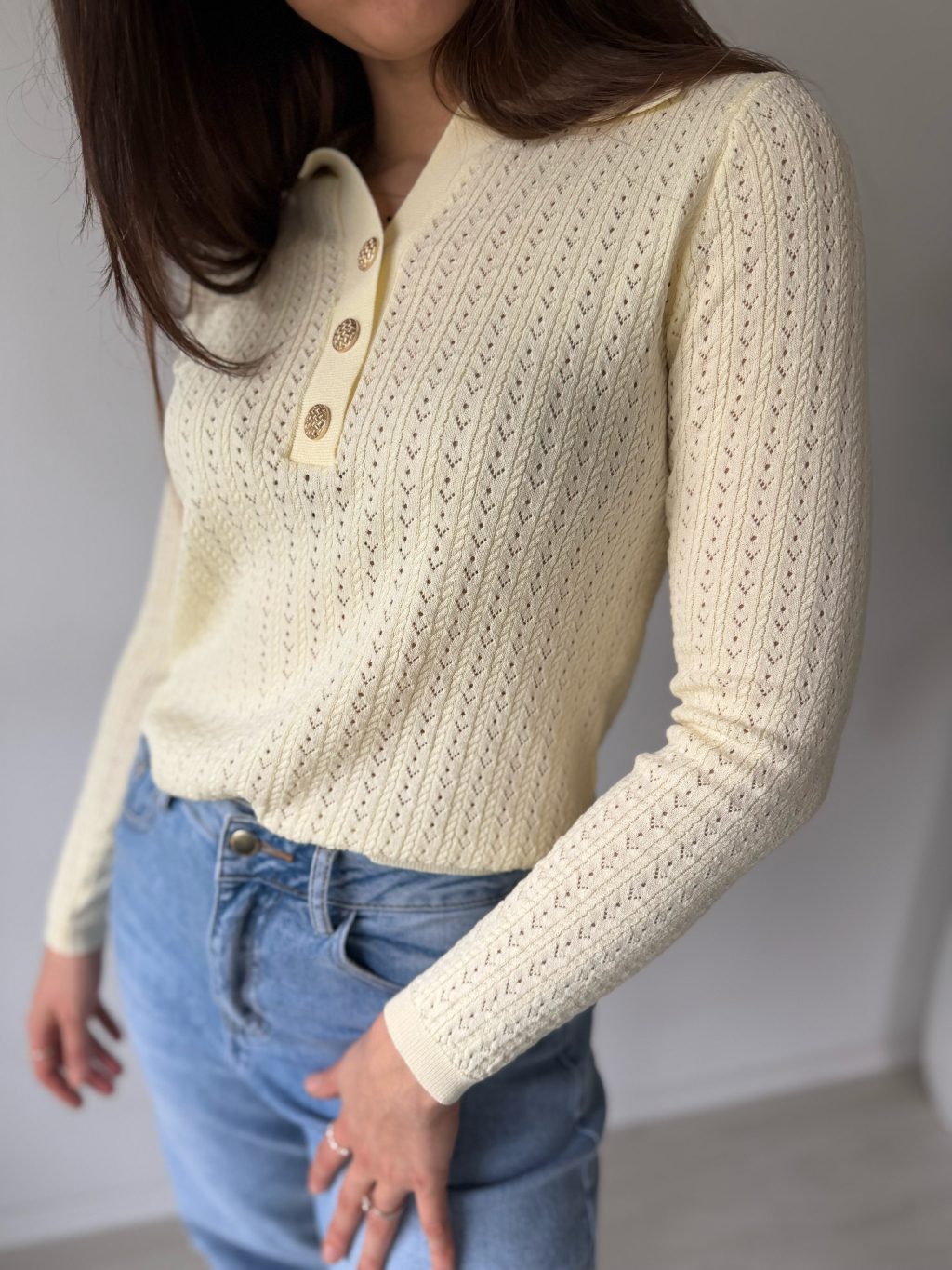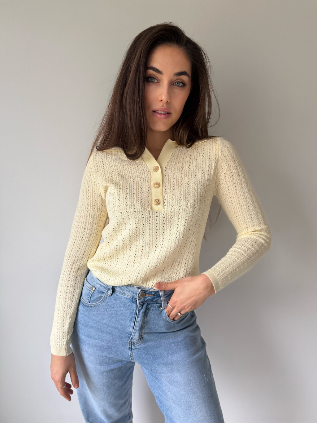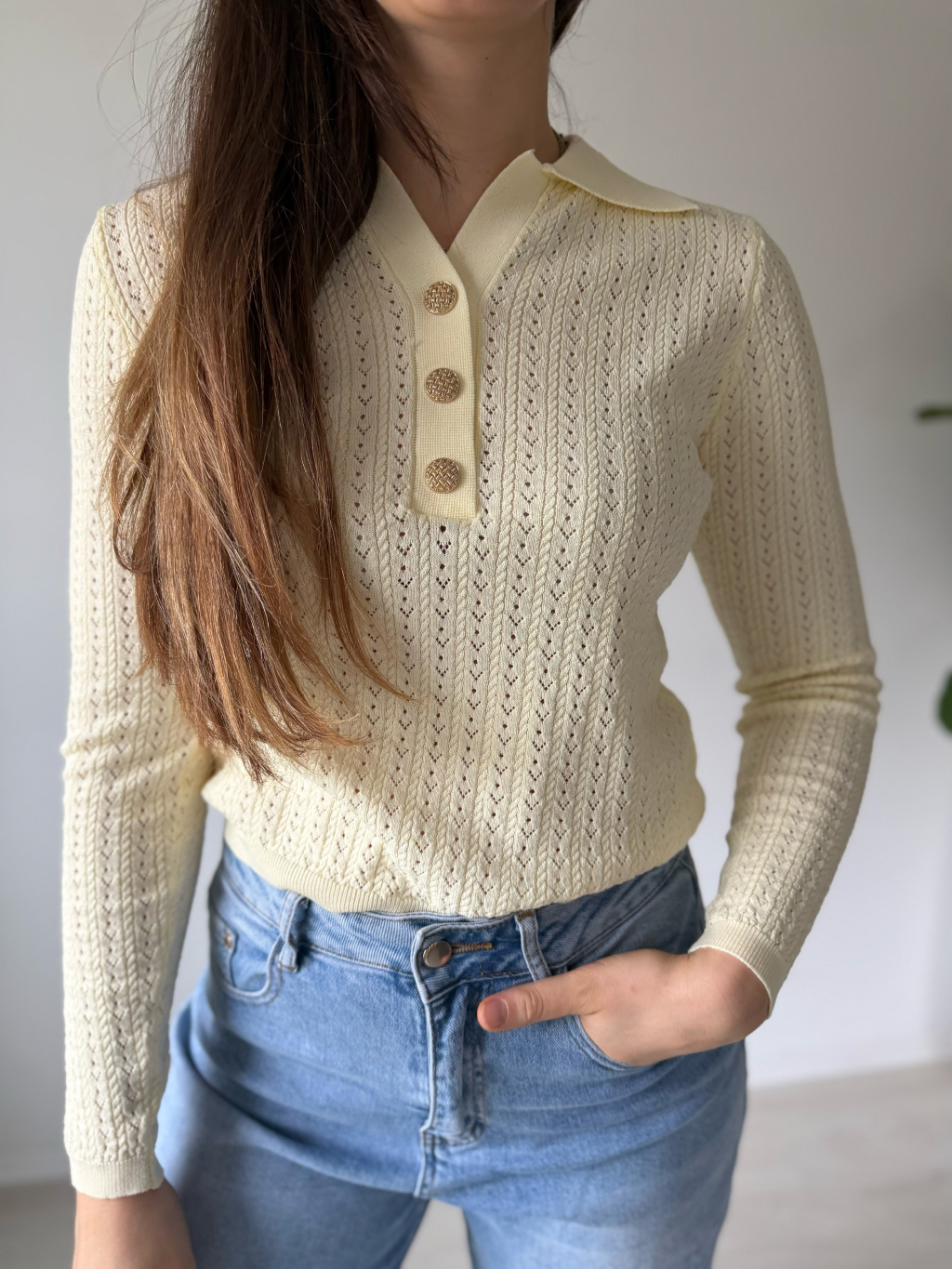 Lehký jarní svetřík s límečkem. Dírkovaný vzor. Zapínání na zdobené knoflíky.