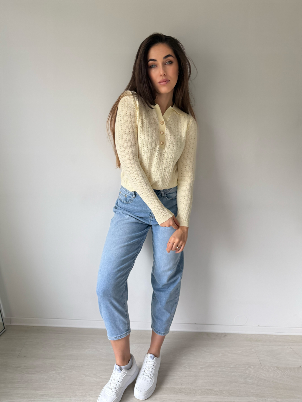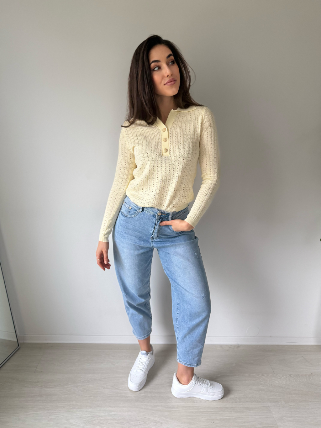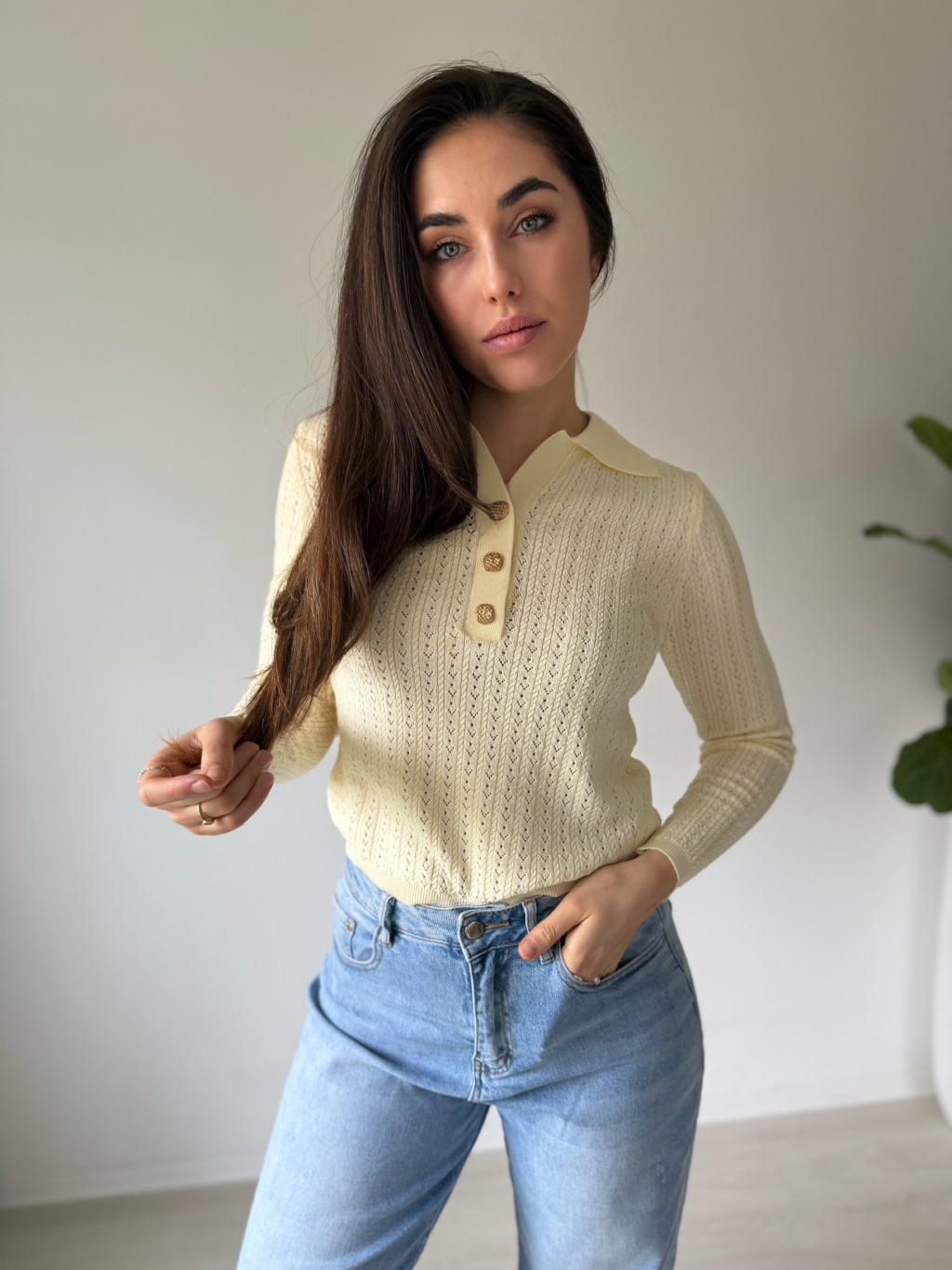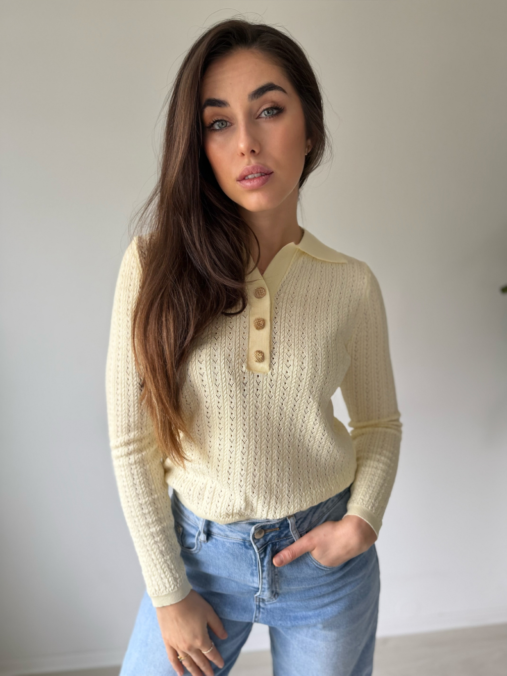 Lehký jarní svetřík s límečkem. Dírkovaný vzor. Zapínání na zdobené knoflíky.