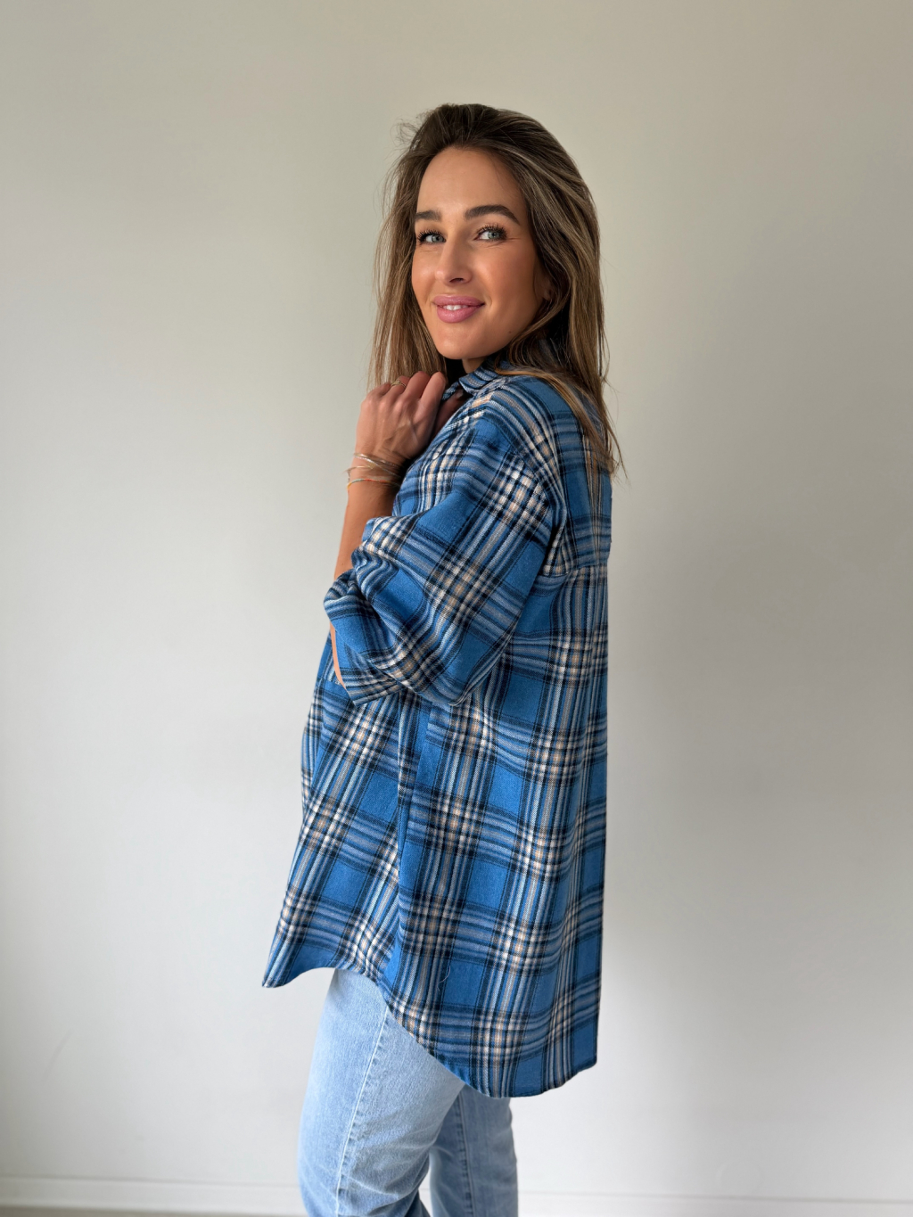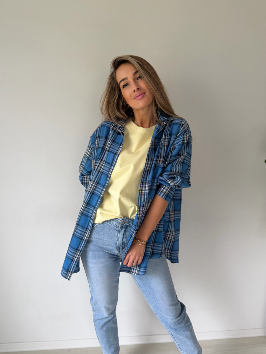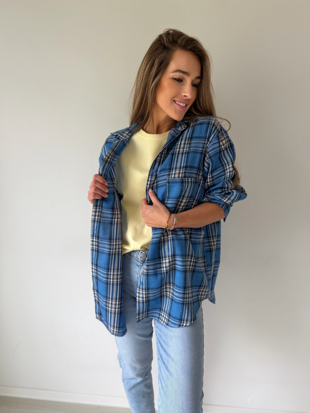 Károvaná košile. Zadní část prodloužená. Zapínání na knoflíky. Volný střih.