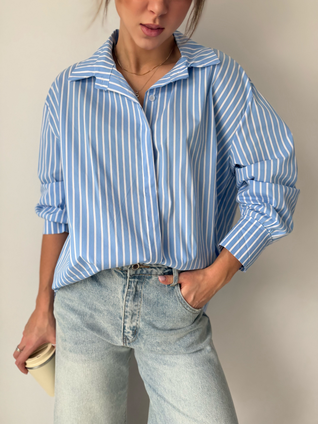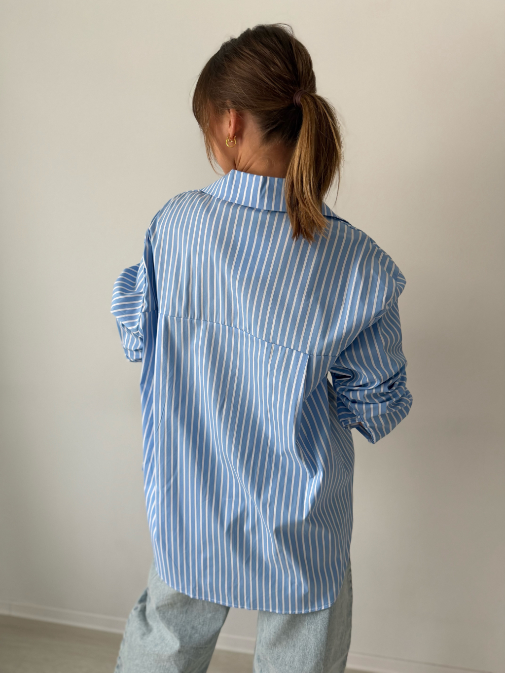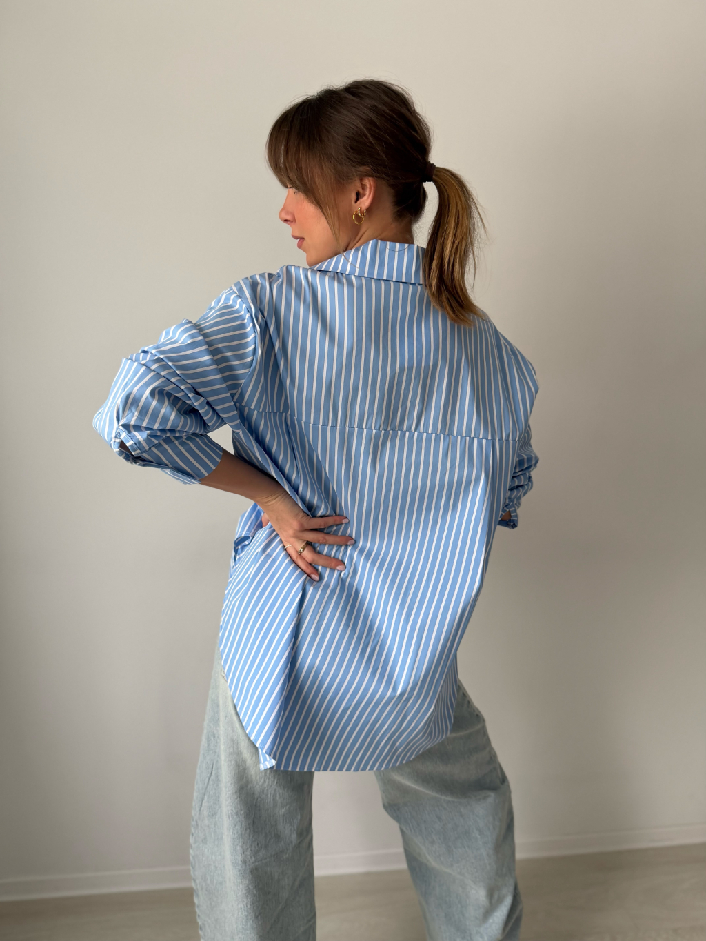 Pruhovaná košile se zapínáním na knoflíky, které jsou překryté. Na zádech prodloužená.