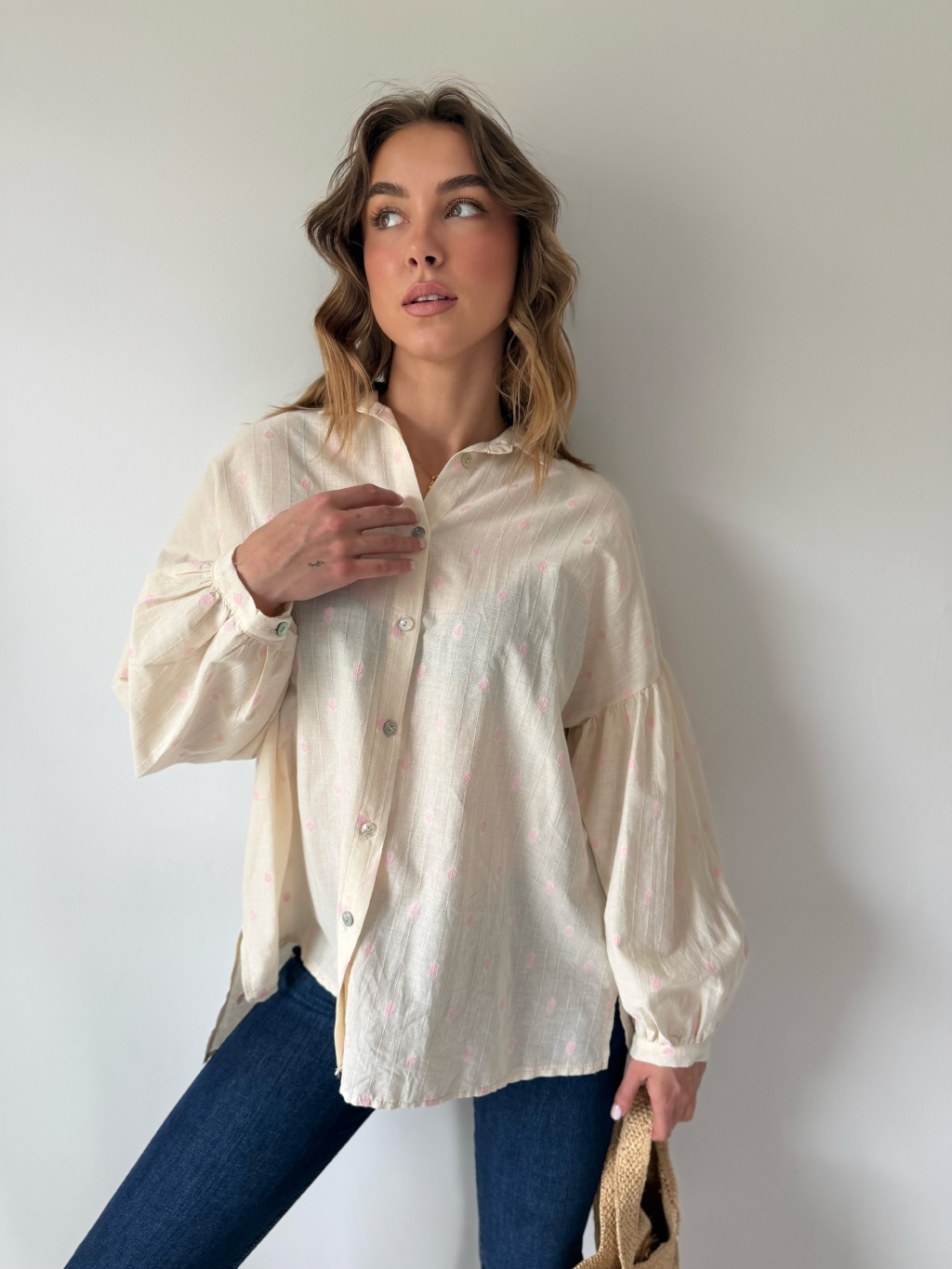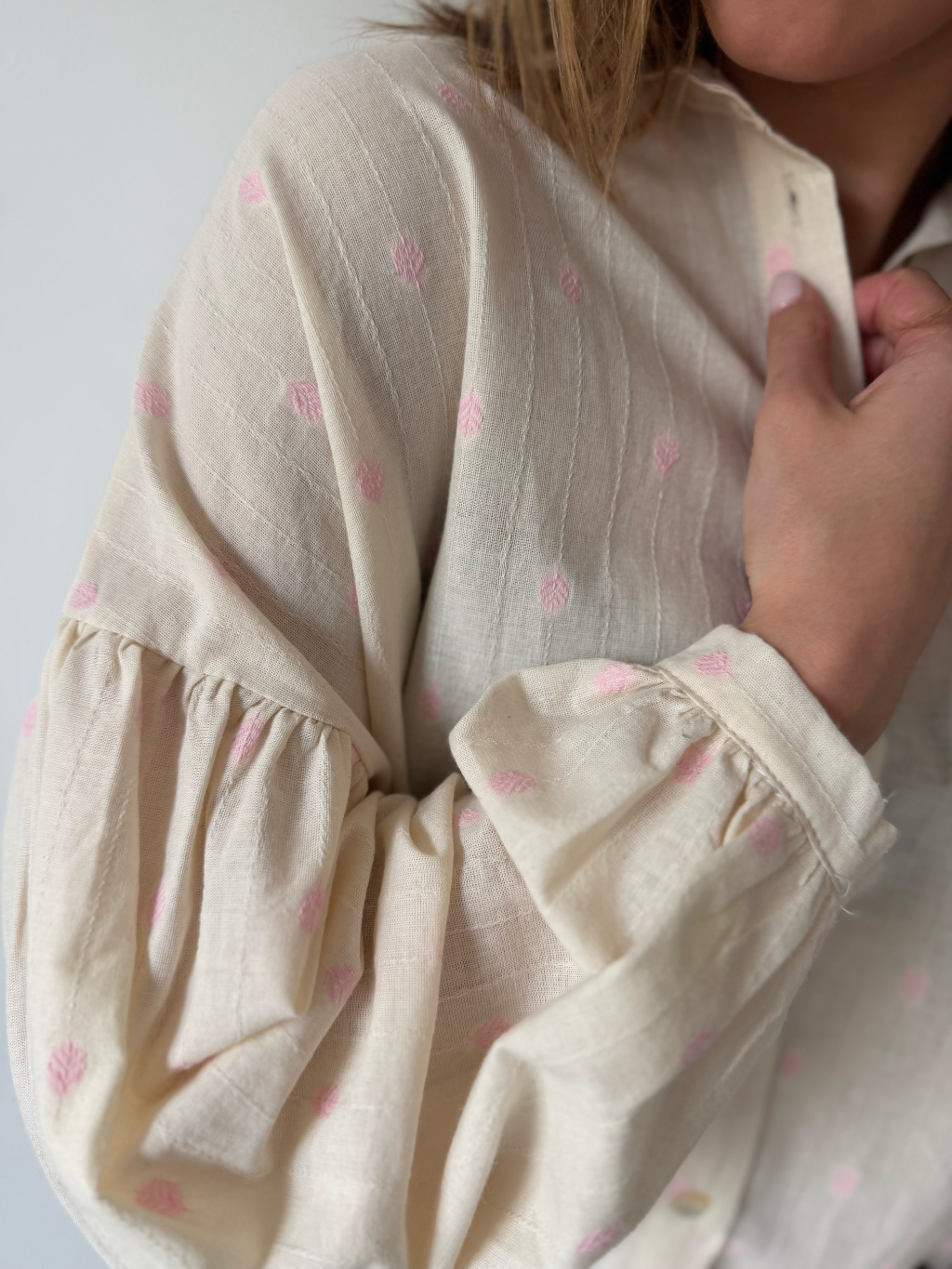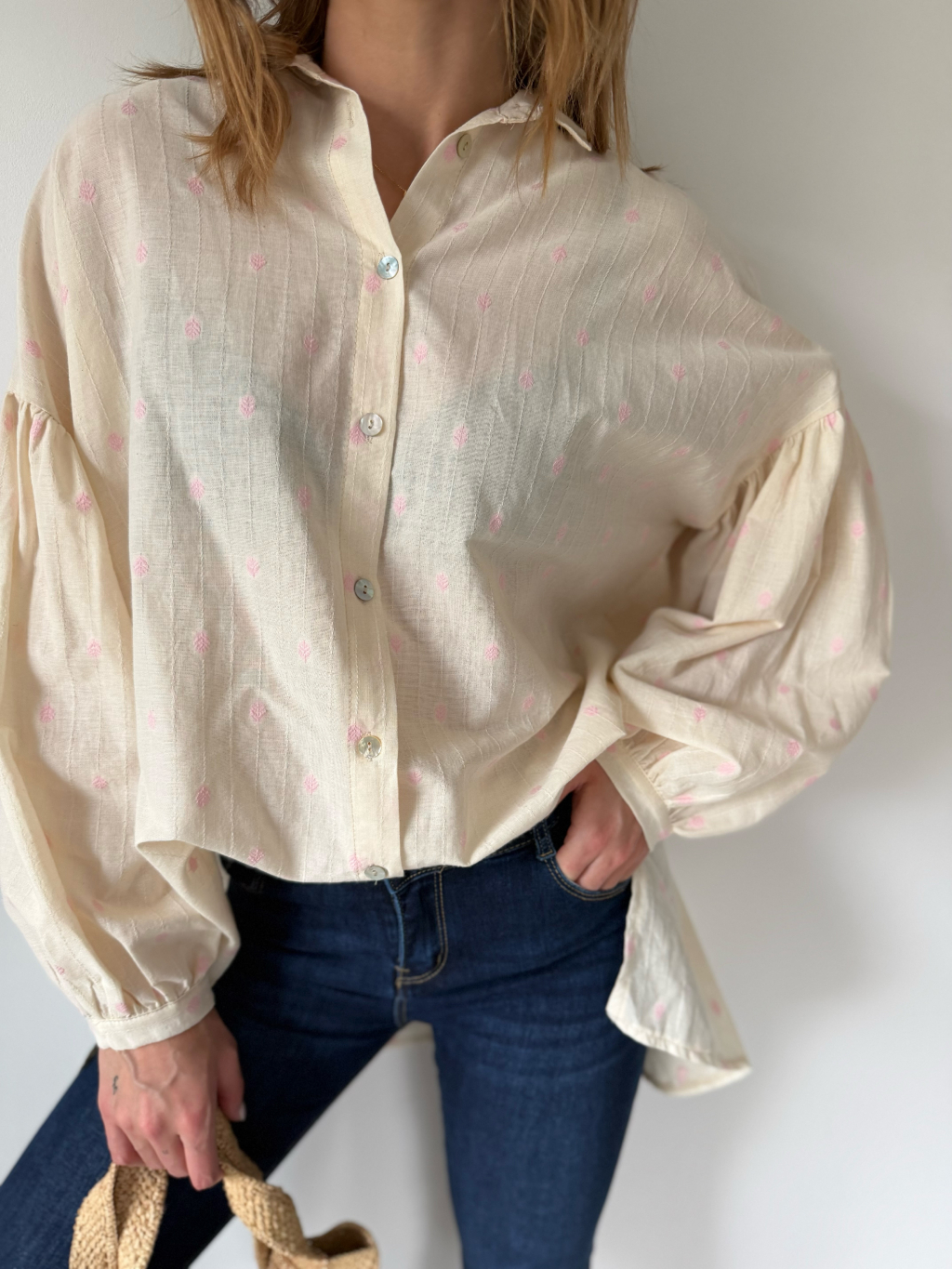 Košile s balonovými rukávy. Zapínání na knoflíky. Zadní část prodloužená.