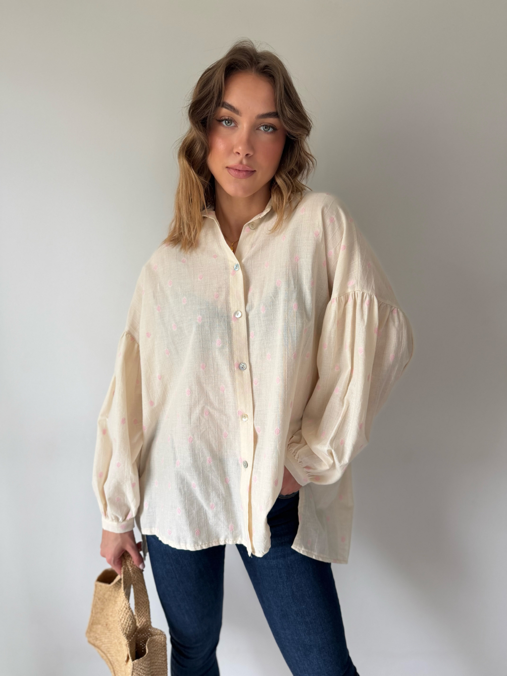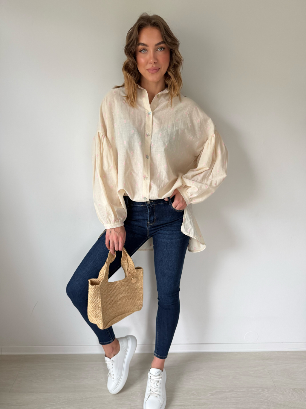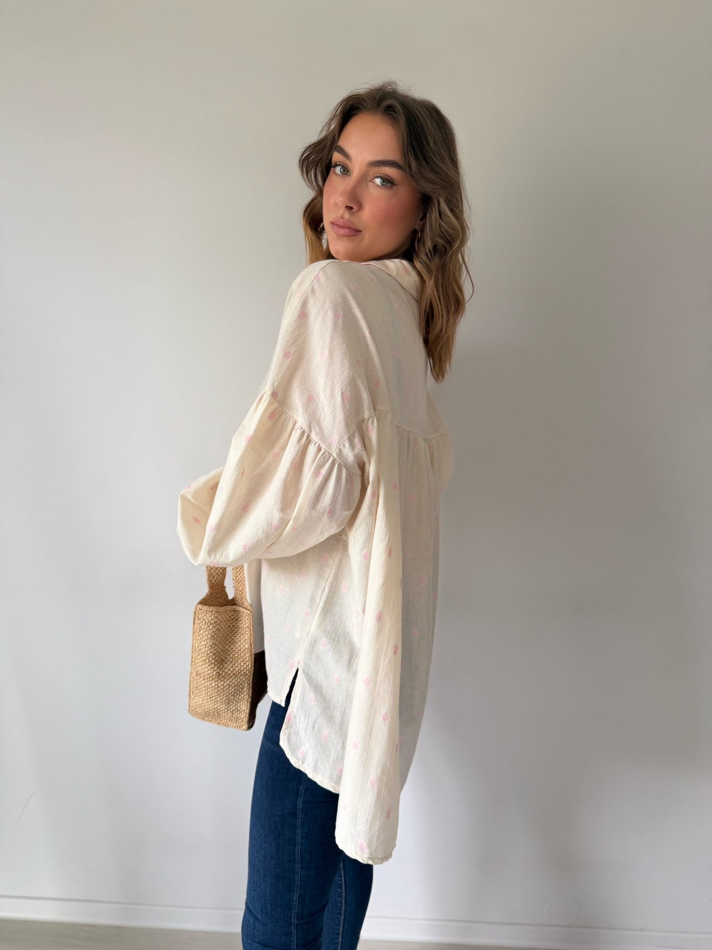 Košile s balonovými rukávy. Zapínání na knoflíky. Zadní část prodloužená.