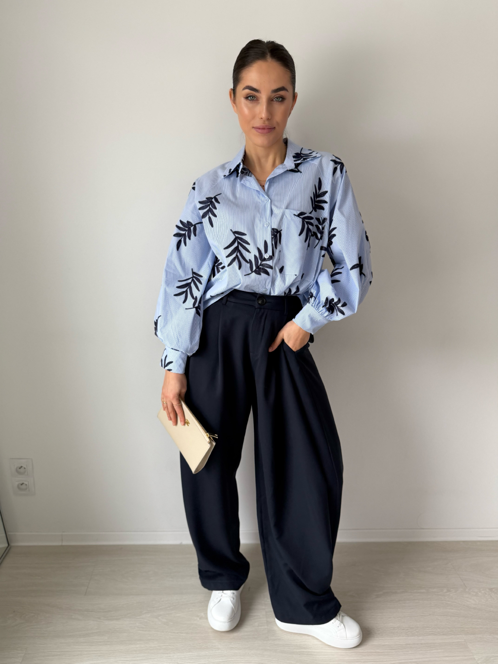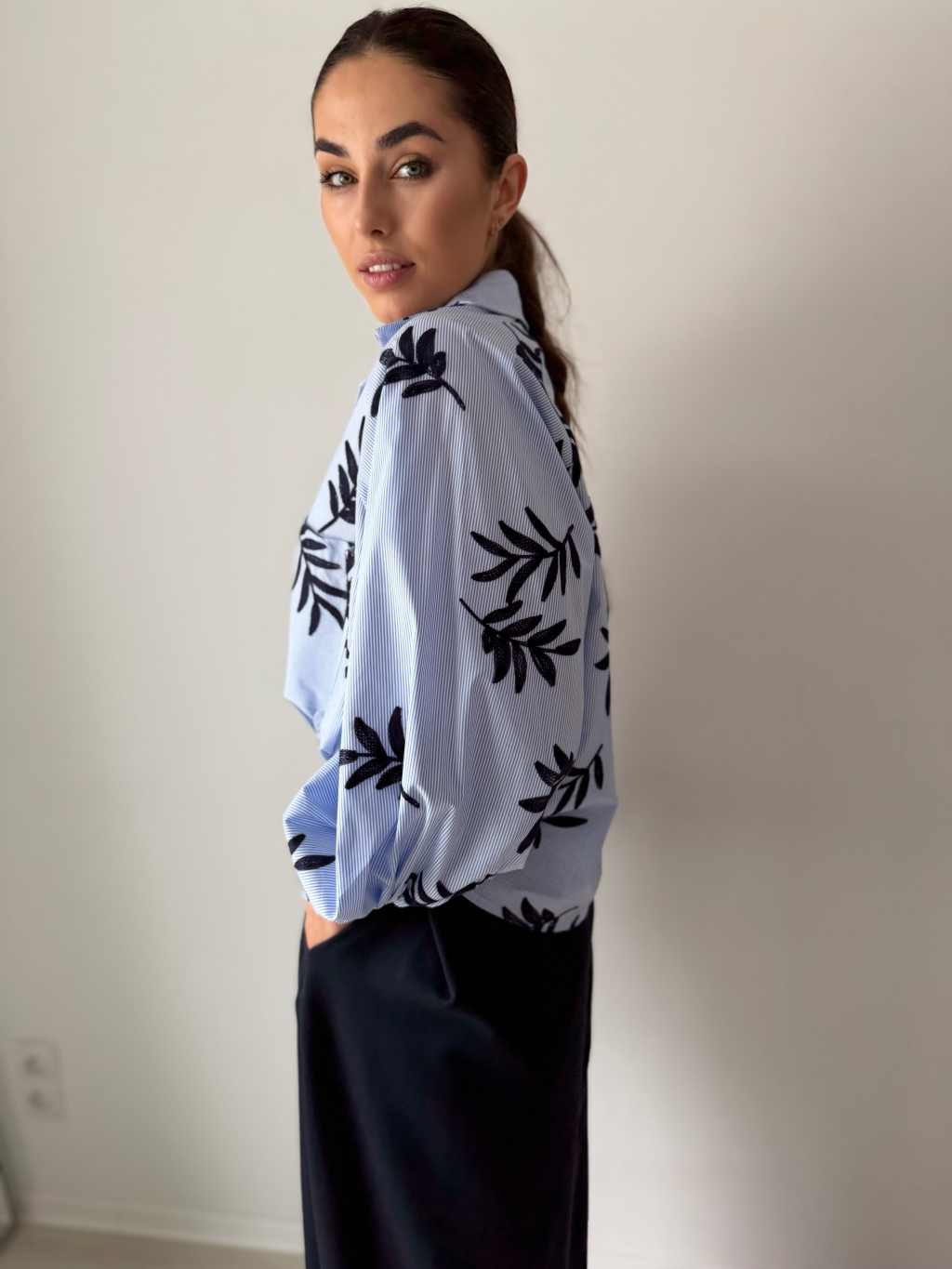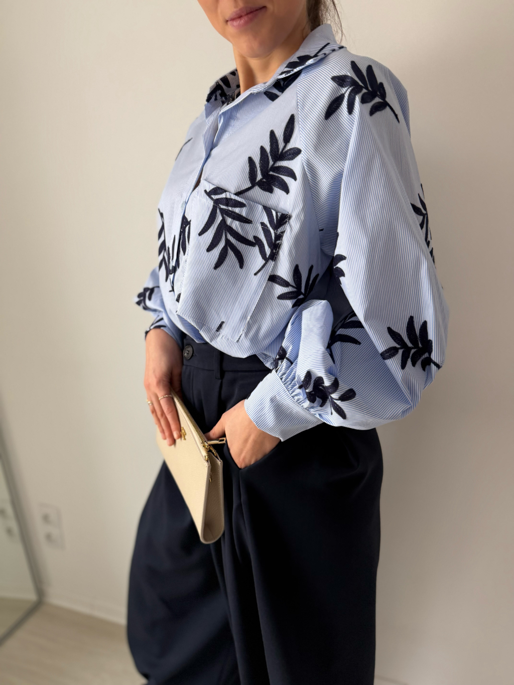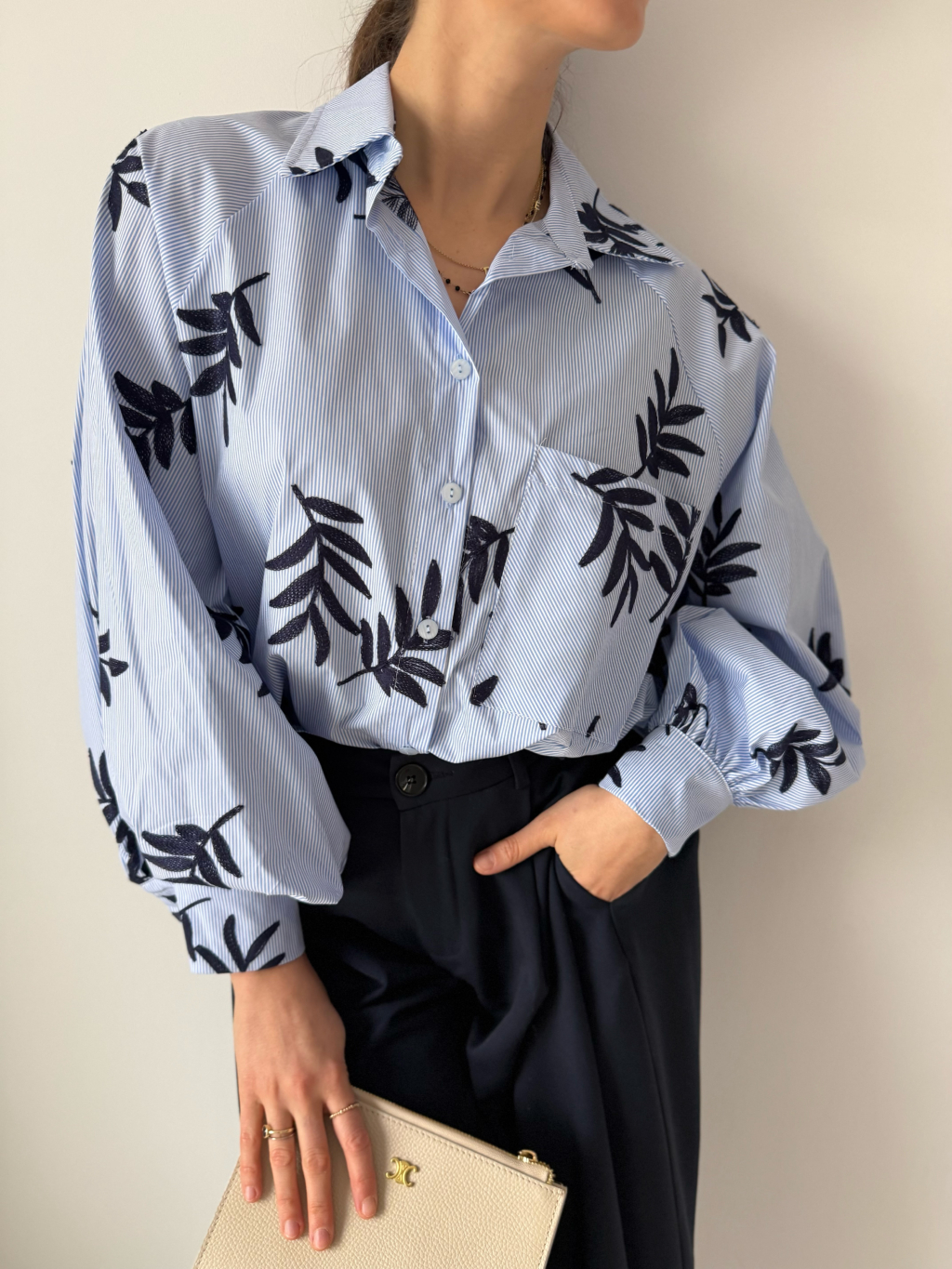 košile, košile s vyšitím, košile s listy, trendy košile, modrá košile
