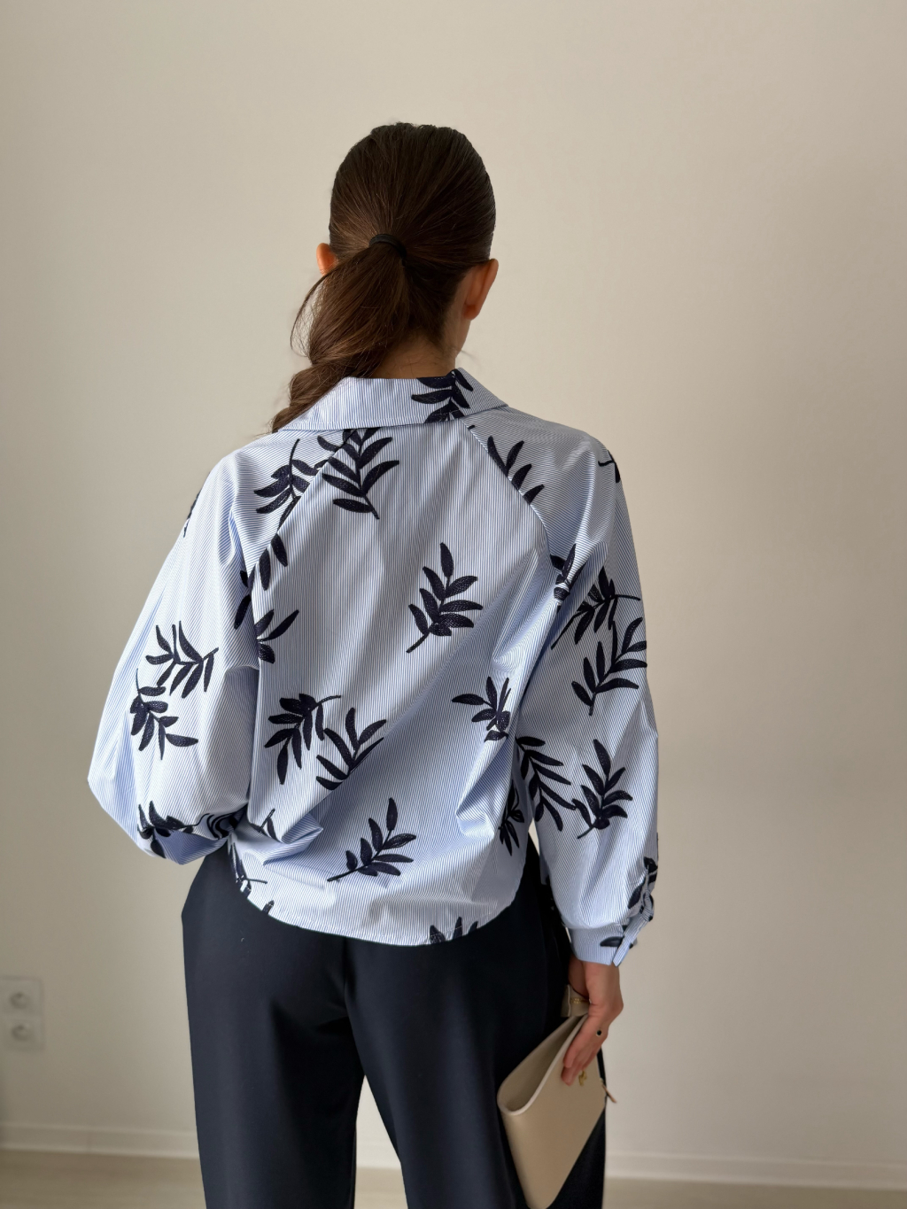 Krátká široká košile s vyšívanými listy. Zapínání na knoflíky.