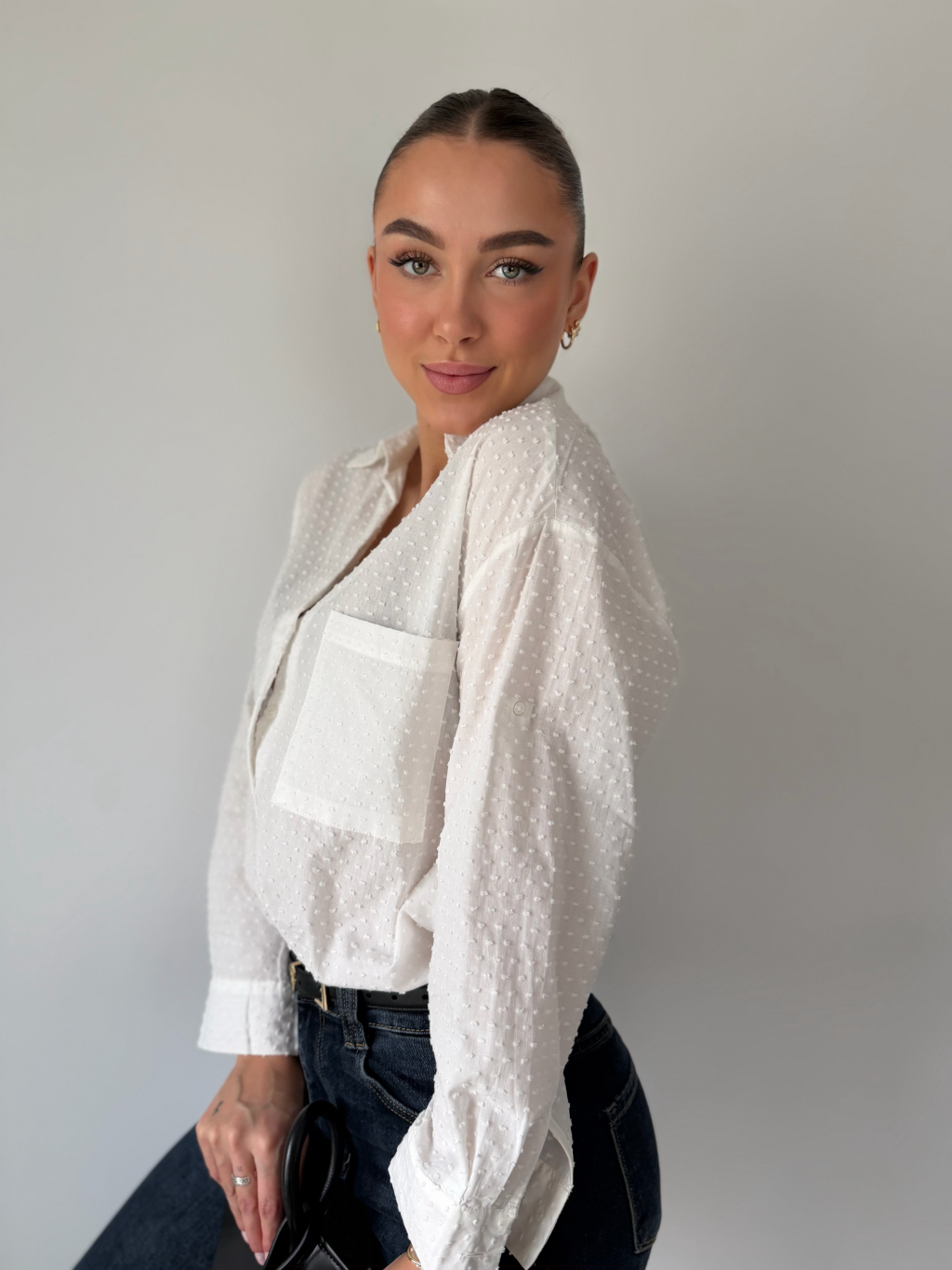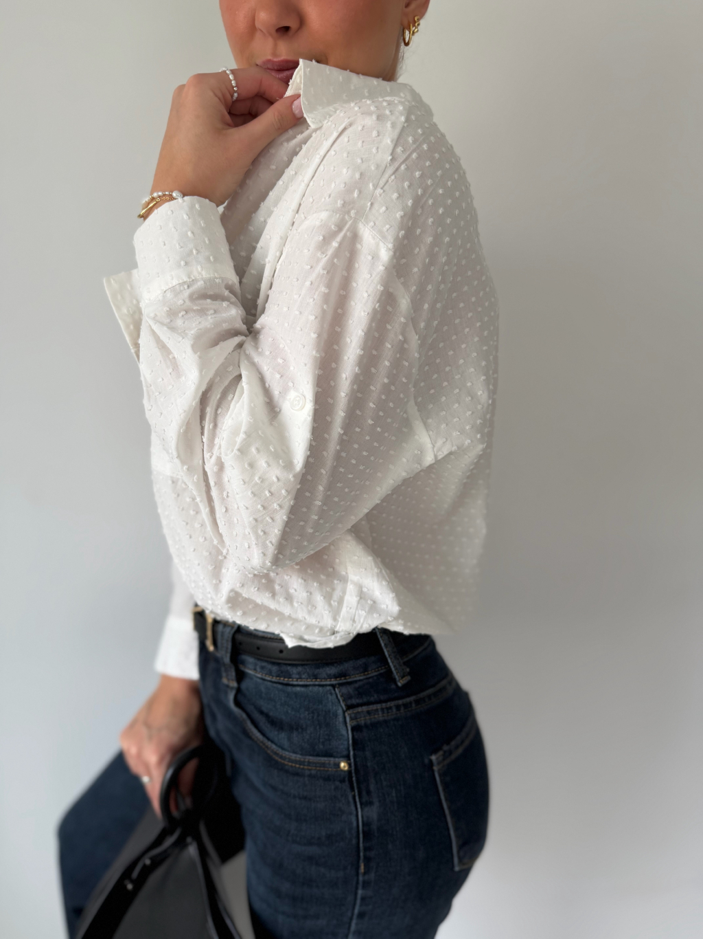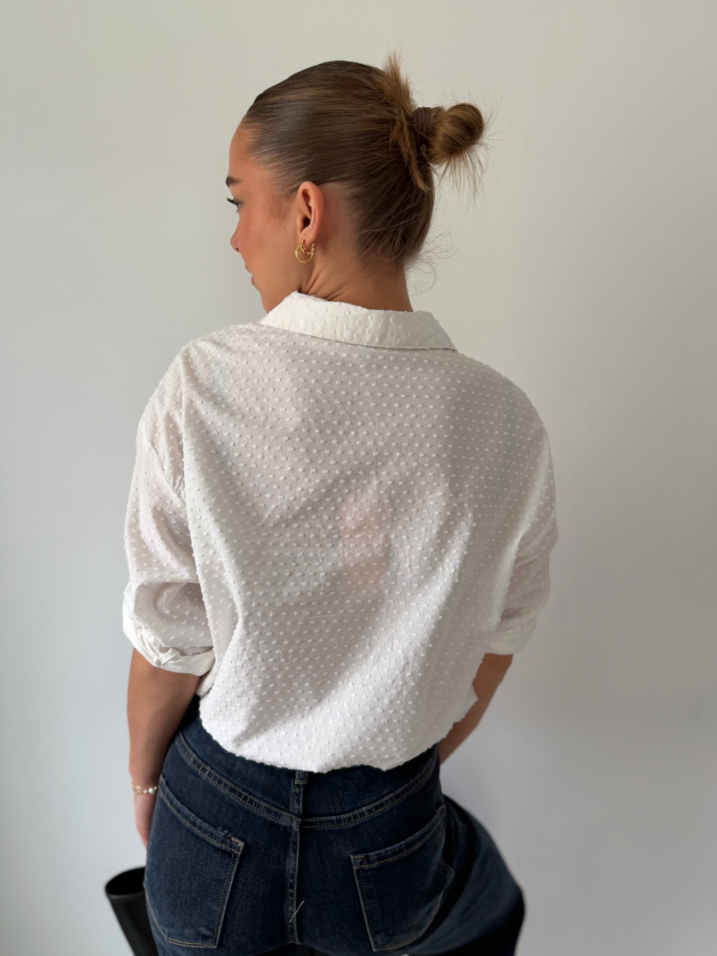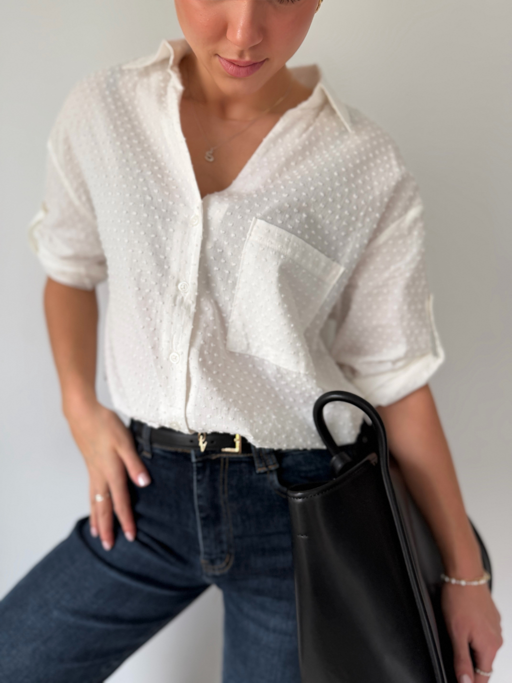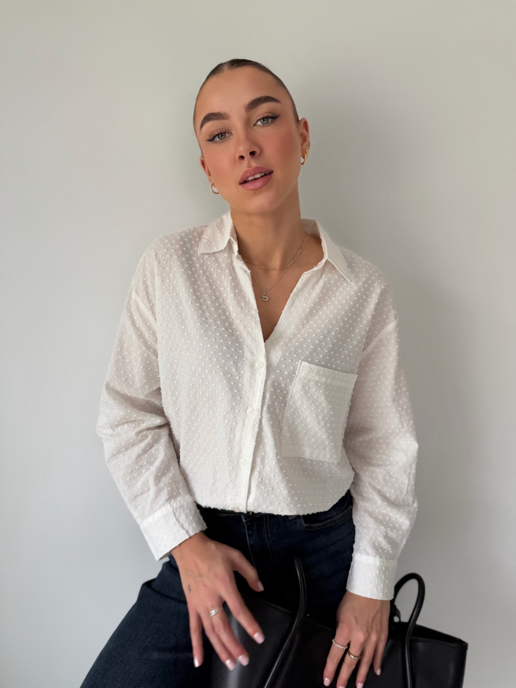 Košile se zapínáním na knoflíky. Na zádech mírně prodloužená. Košile má puntíky ve stejné barvě, které mírně vyčnívají. Jedna náprsní kapsa. Možnost ohrnutí rukávu se zapnutím na knoflík.