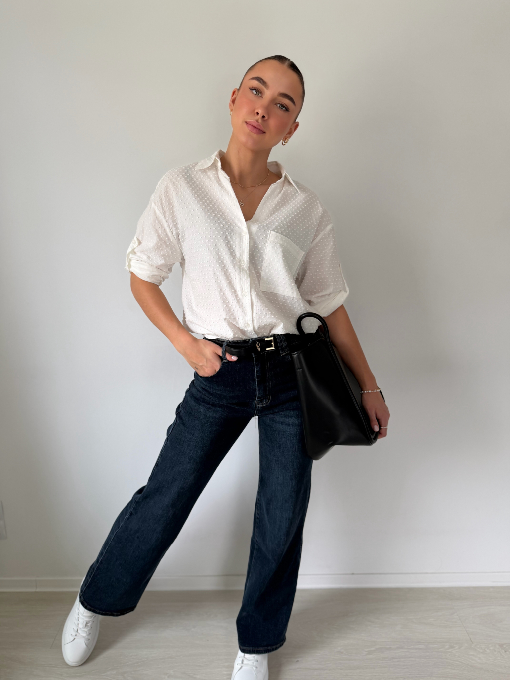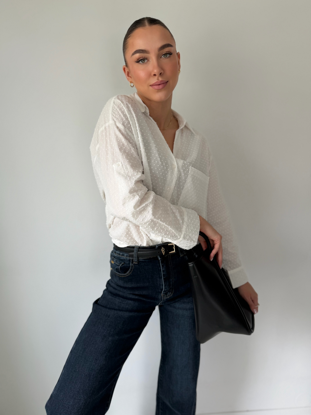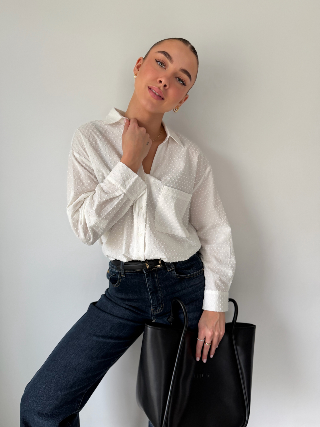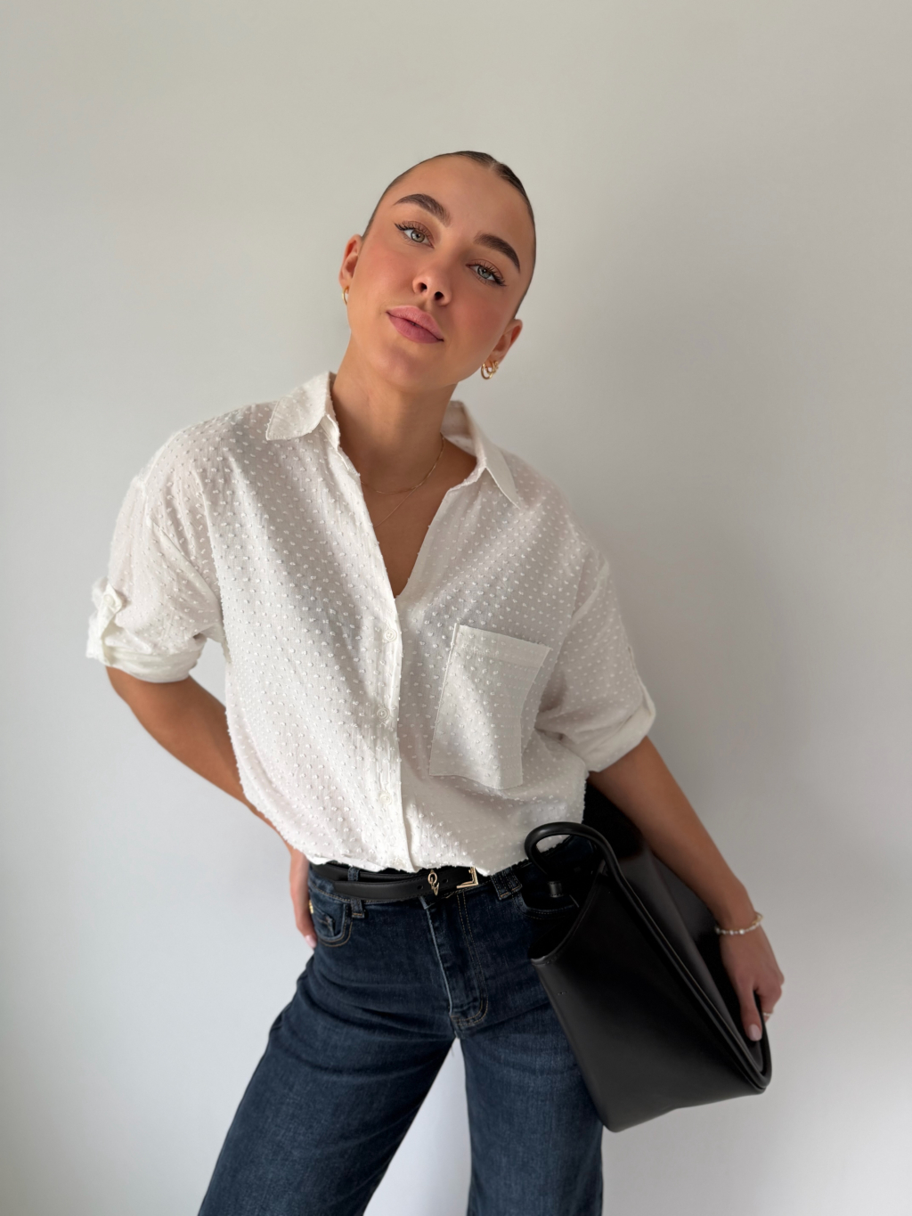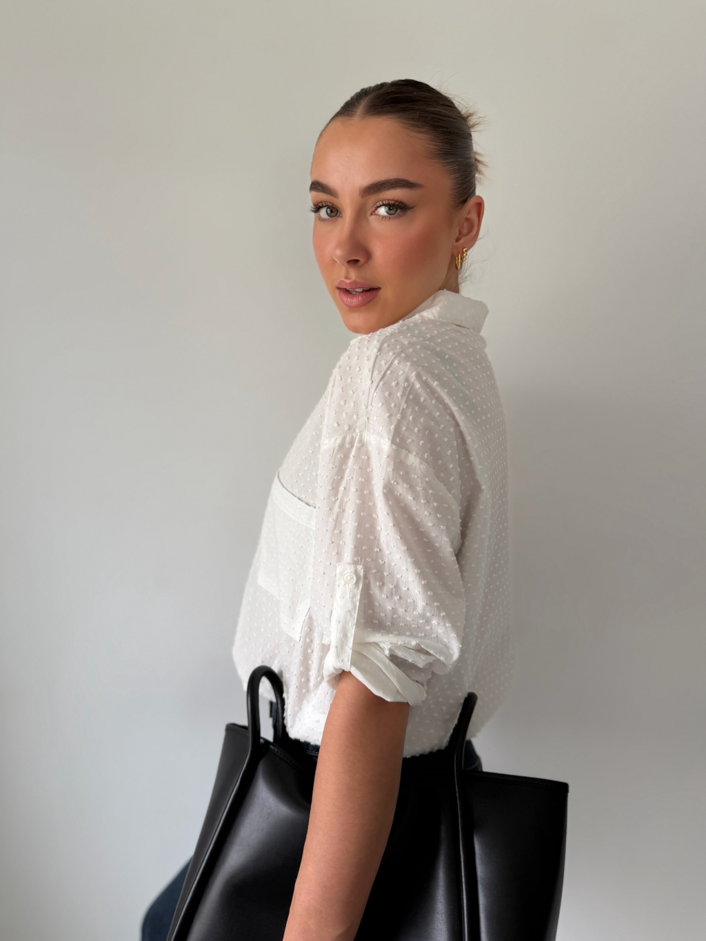 Košile se zapínáním na knoflíky. Na zádech mírně prodloužená. Košile má puntíky ve stejné barvě, které mírně vyčnívají. Jedna náprsní kapsa. Možnost ohrnutí rukávu se zapnutím na knoflík.