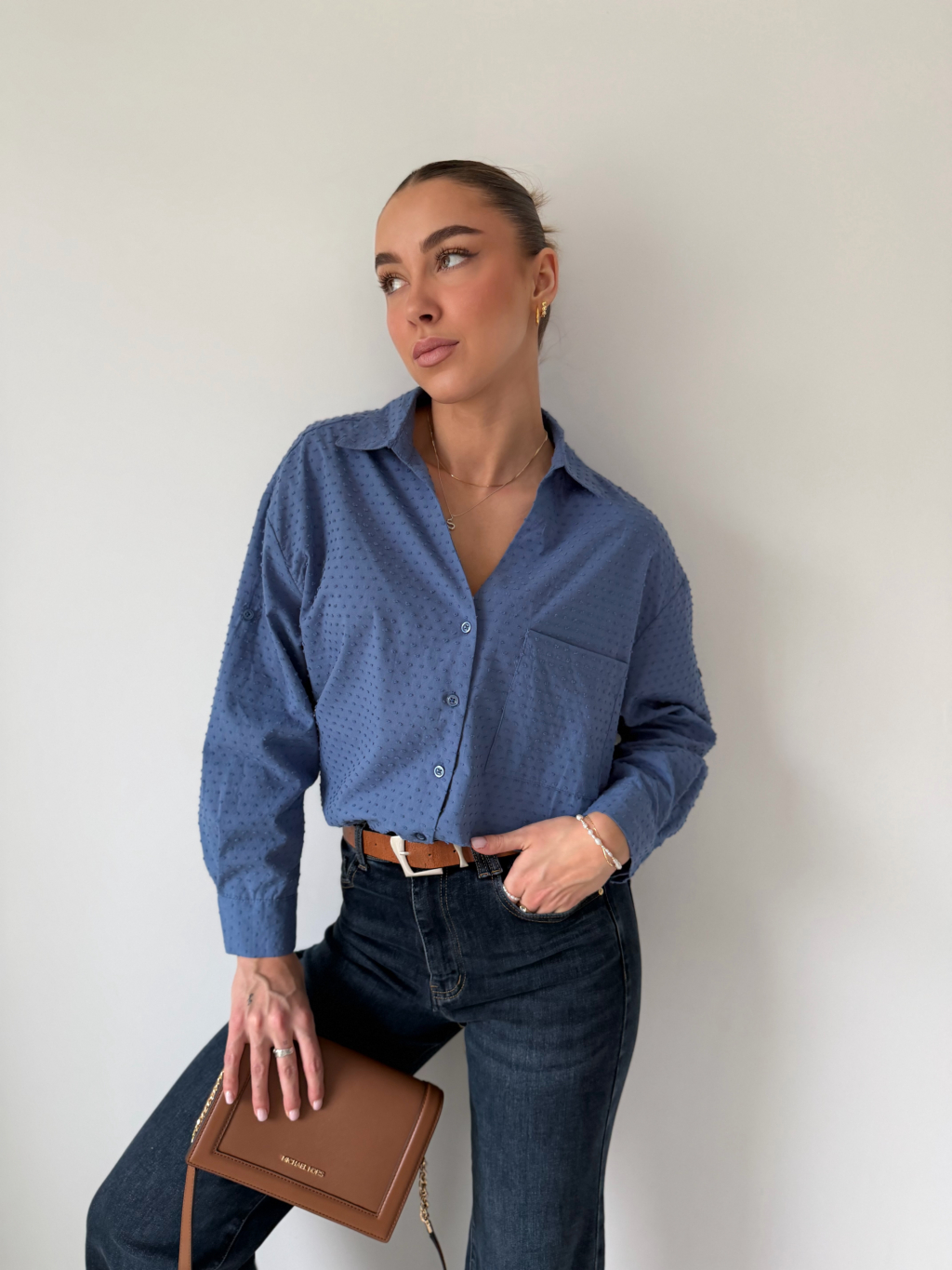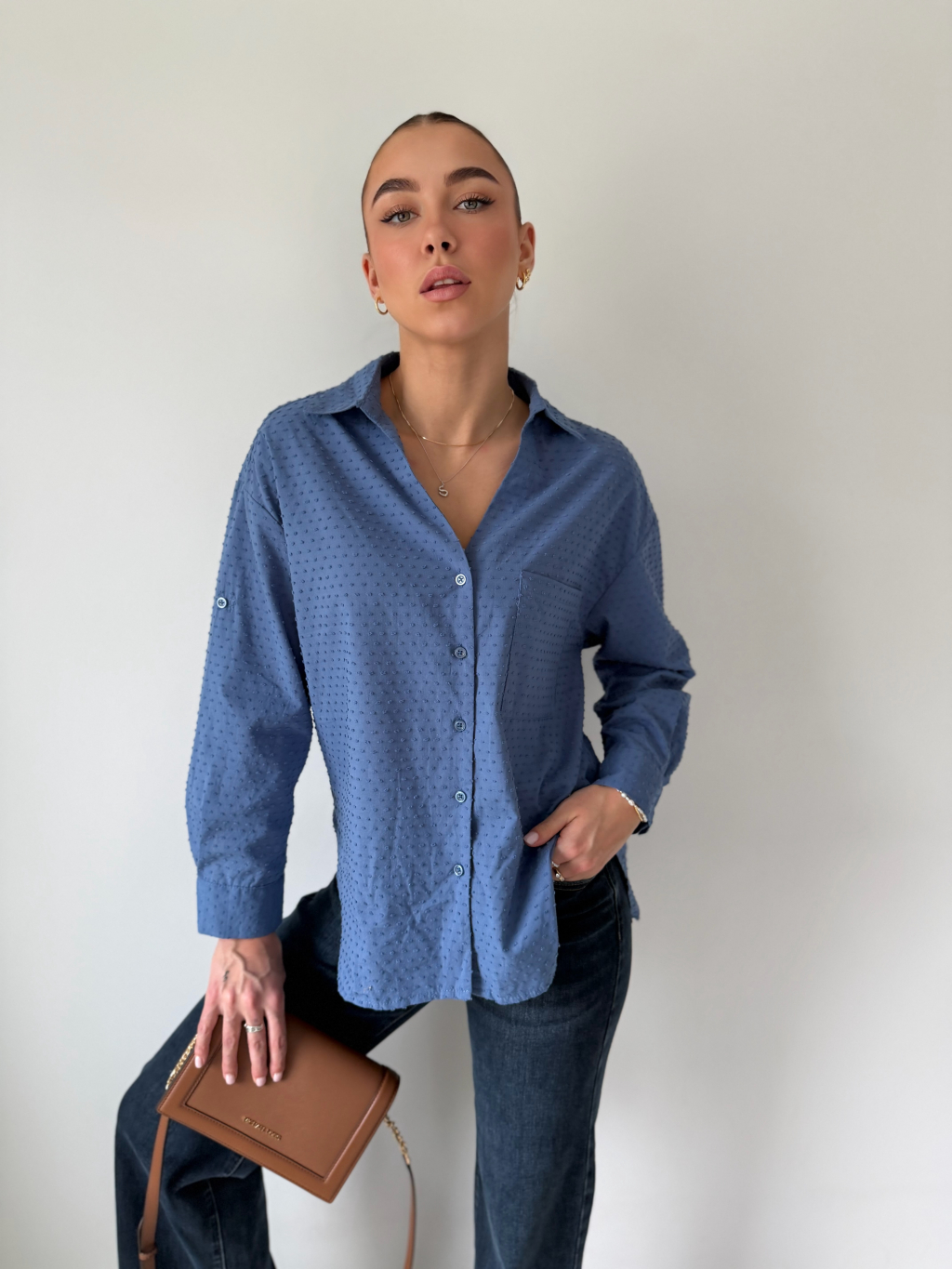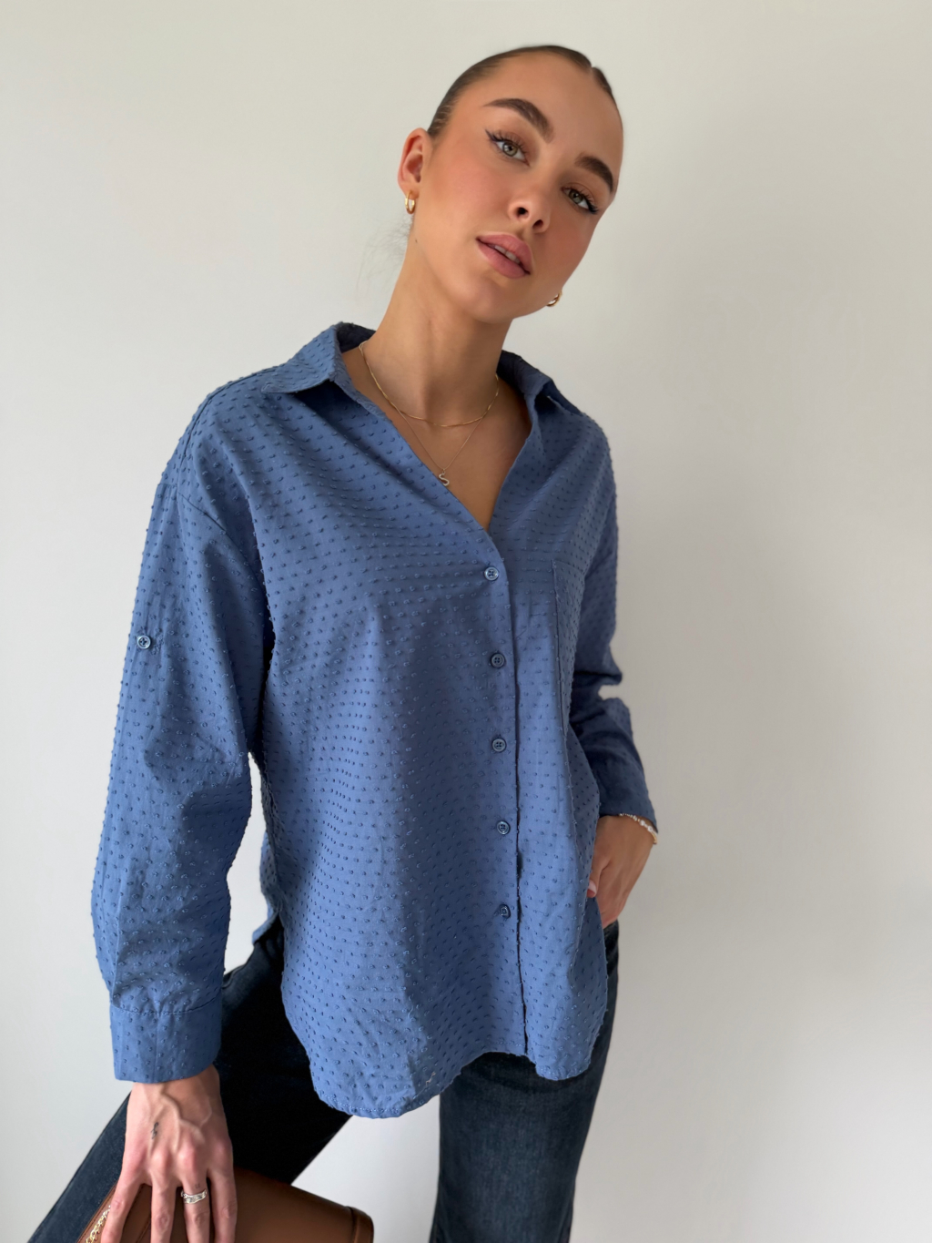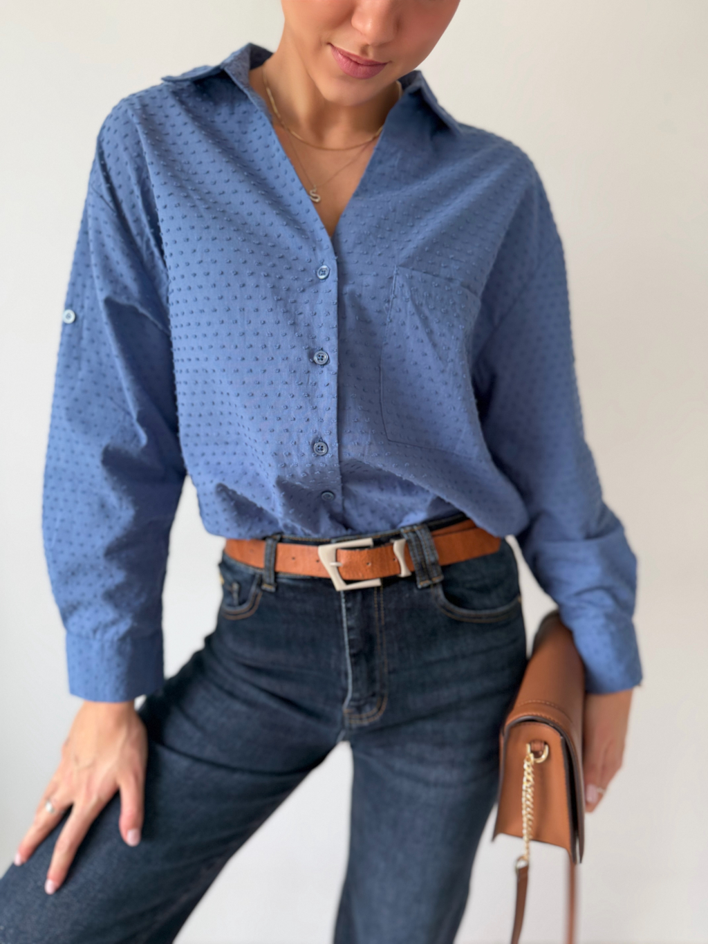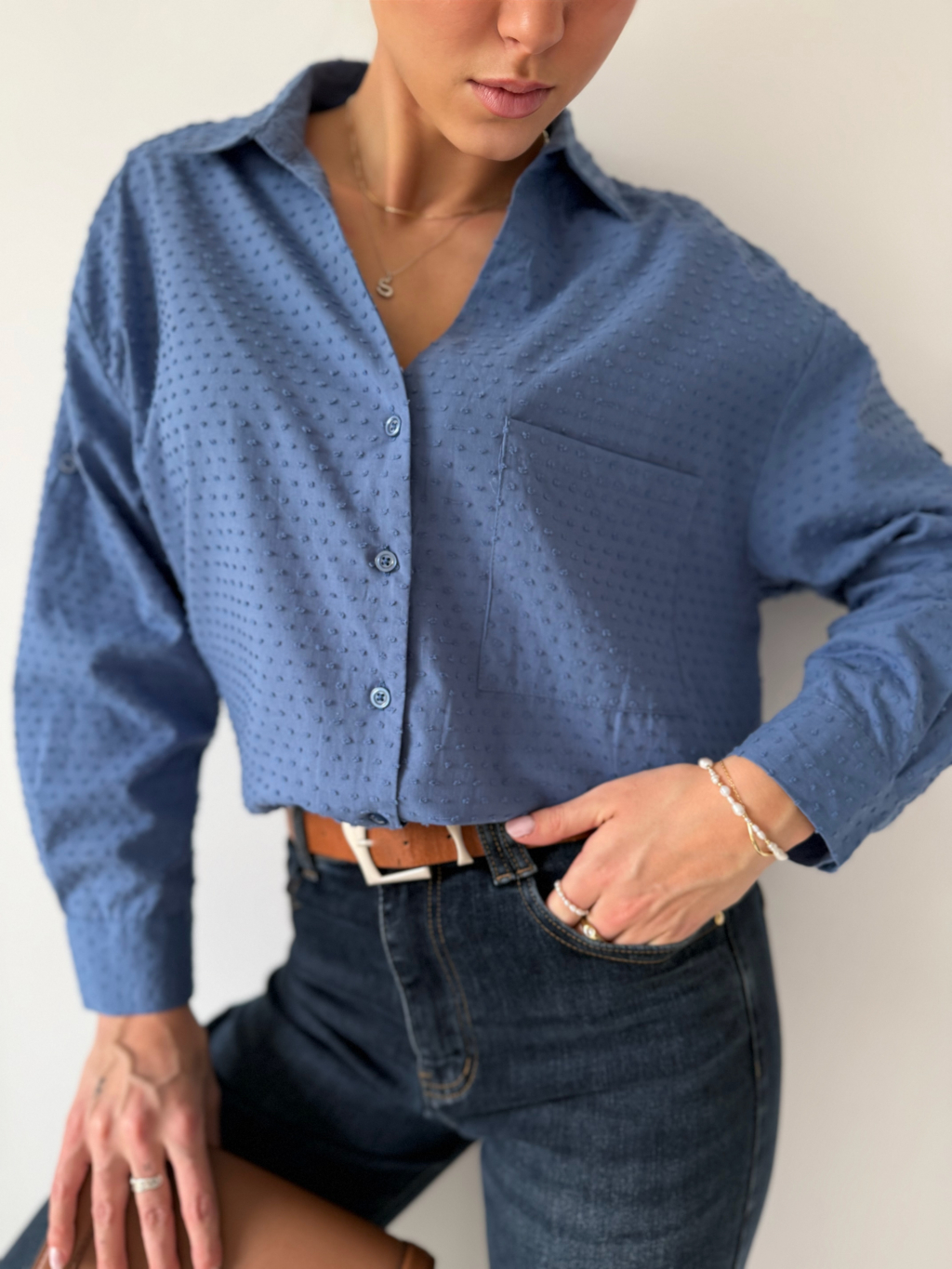 Košile se zapínáním na knoflíky. Na zádech mírně prodloužená. Košile má puntíky ve stejné barvě, které mírně vyčnívají. Jedna náprsní kapsa. Možnost ohrnutí rukávu se zapnutím na knoflík.