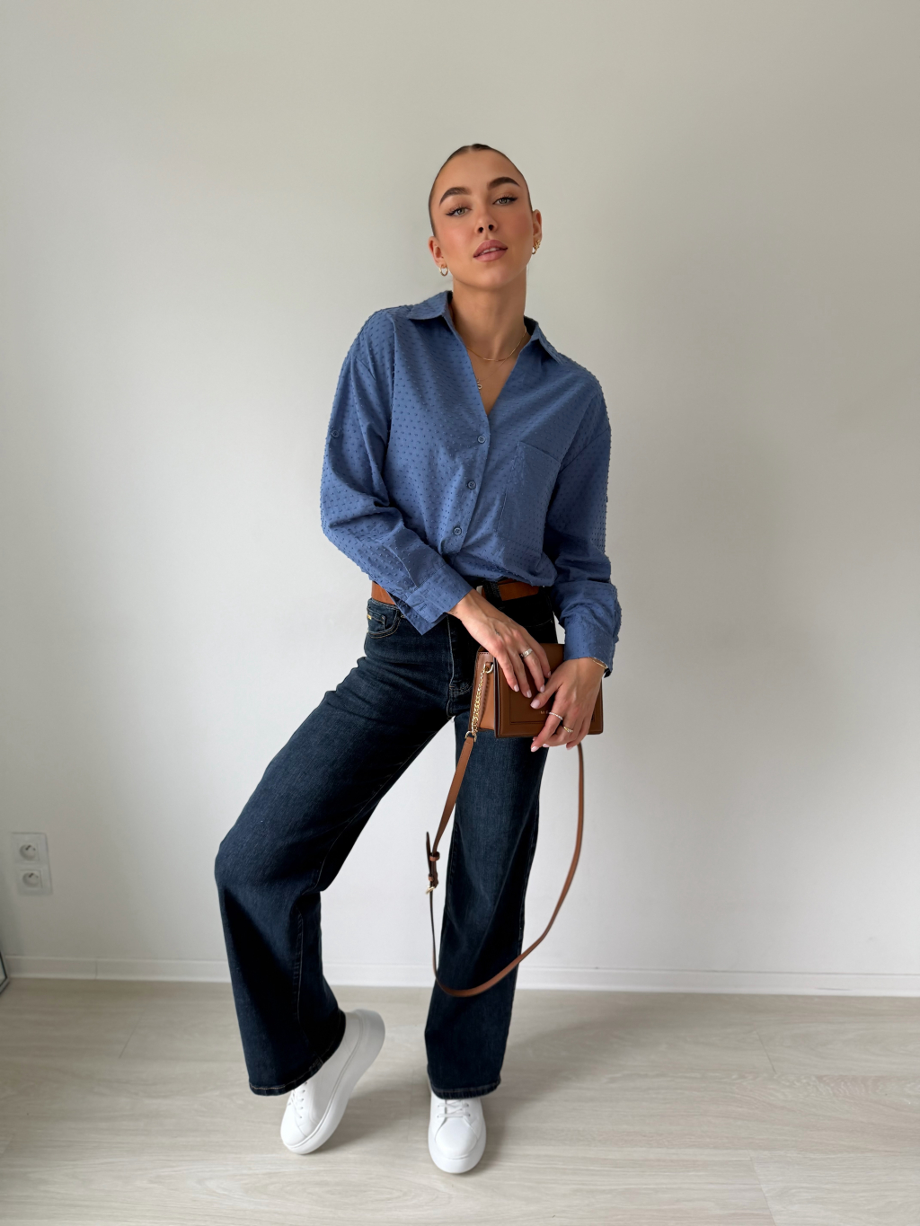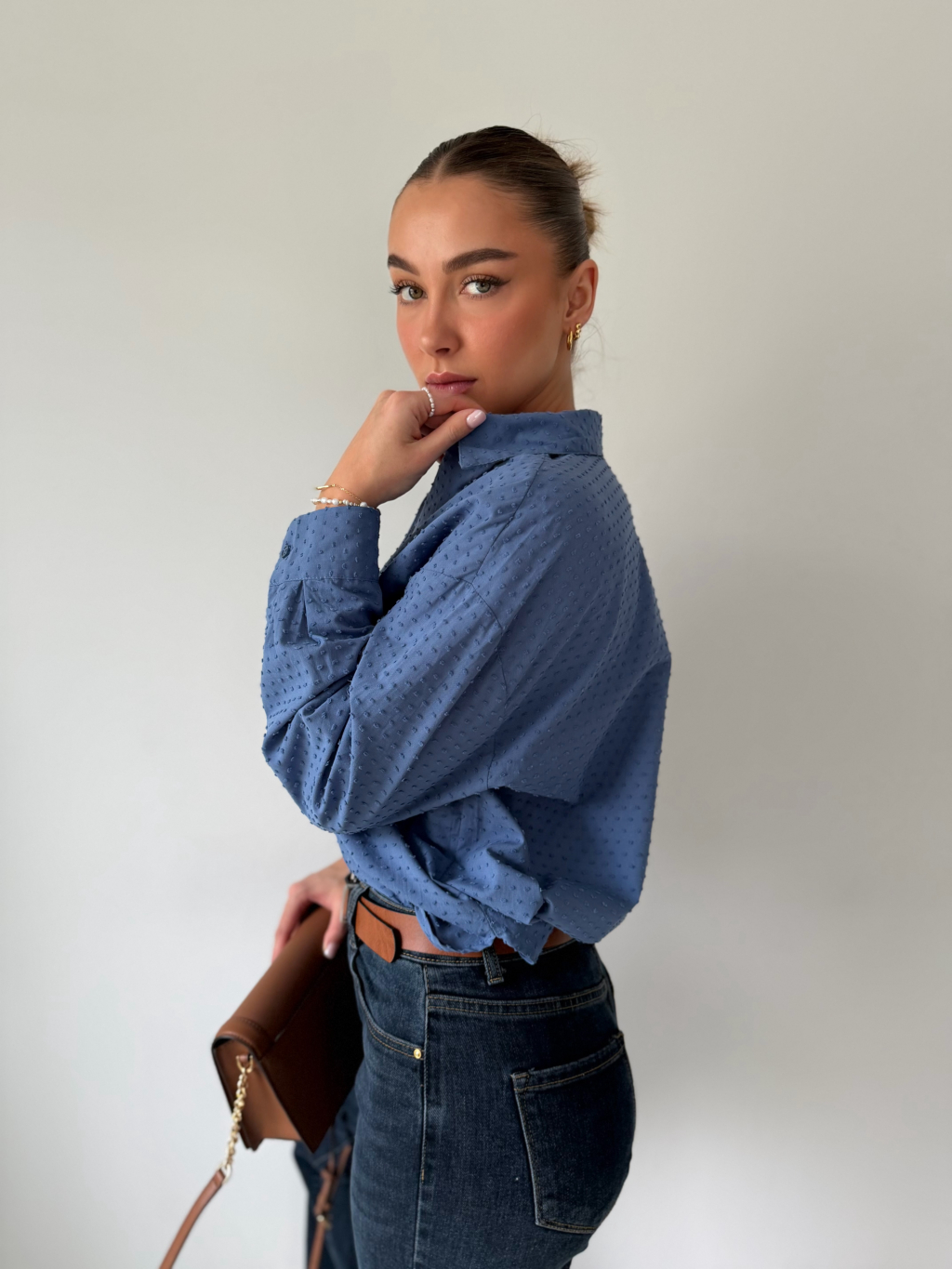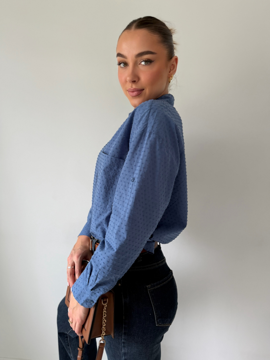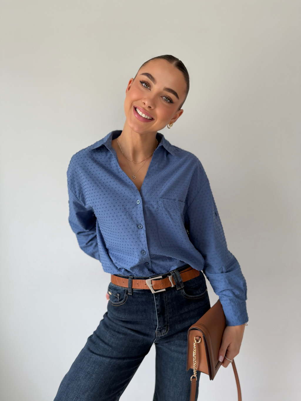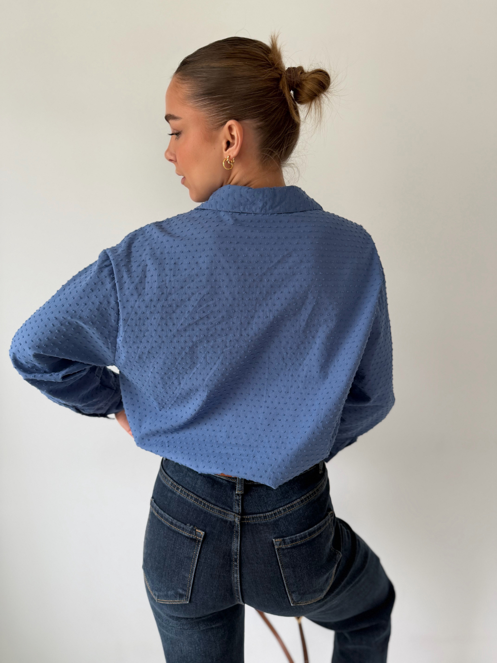 Košile se zapínáním na knoflíky. Na zádech mírně prodloužená. Košile má puntíky ve stejné barvě, které mírně vyčnívají. Jedna náprsní kapsa. Možnost ohrnutí rukávu se zapnutím na knoflík.