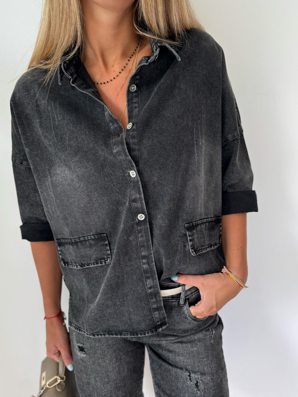 Košile s lehké džínoviny. Košile má volný střih a zapínání na knoflíčky.