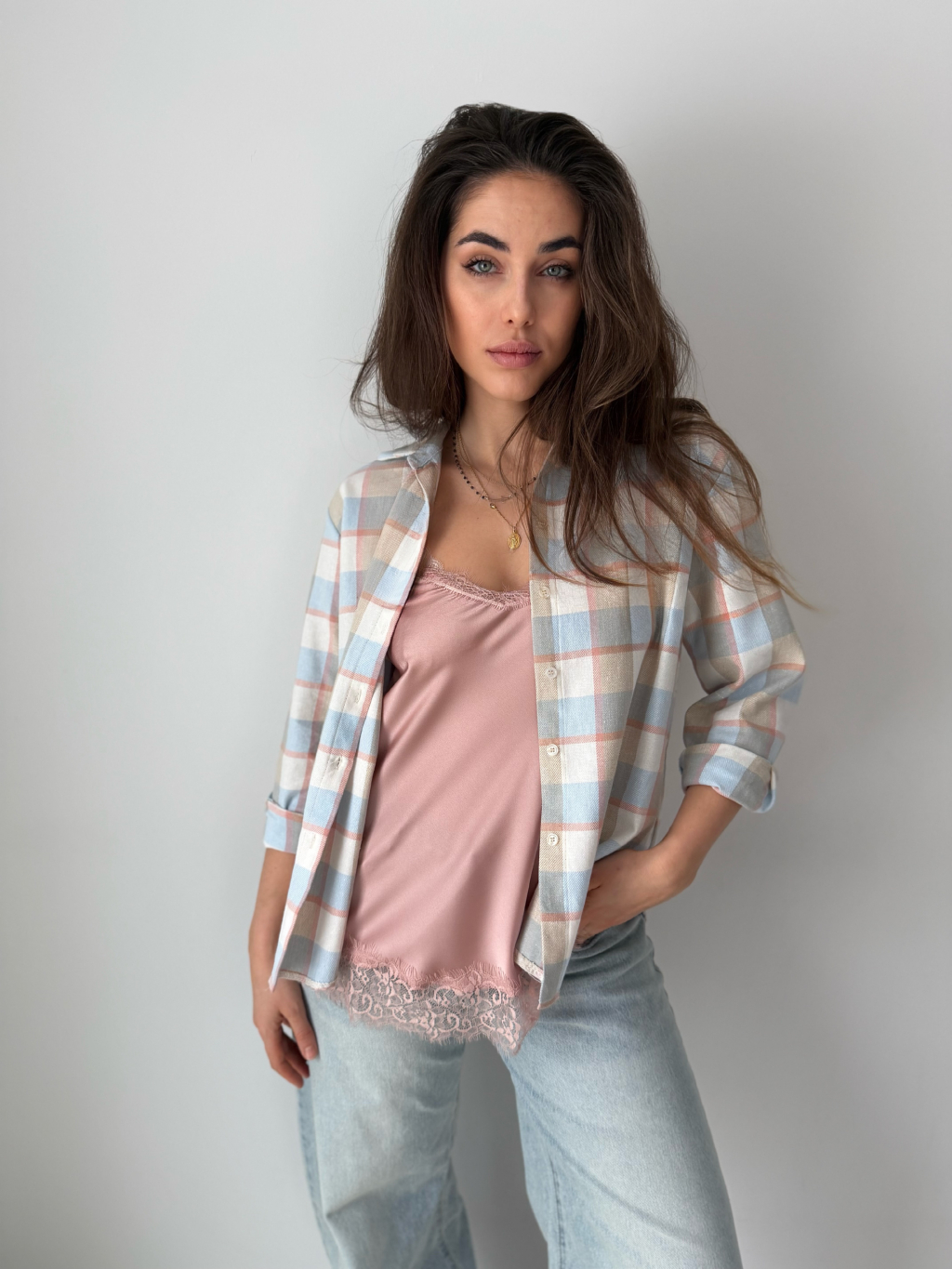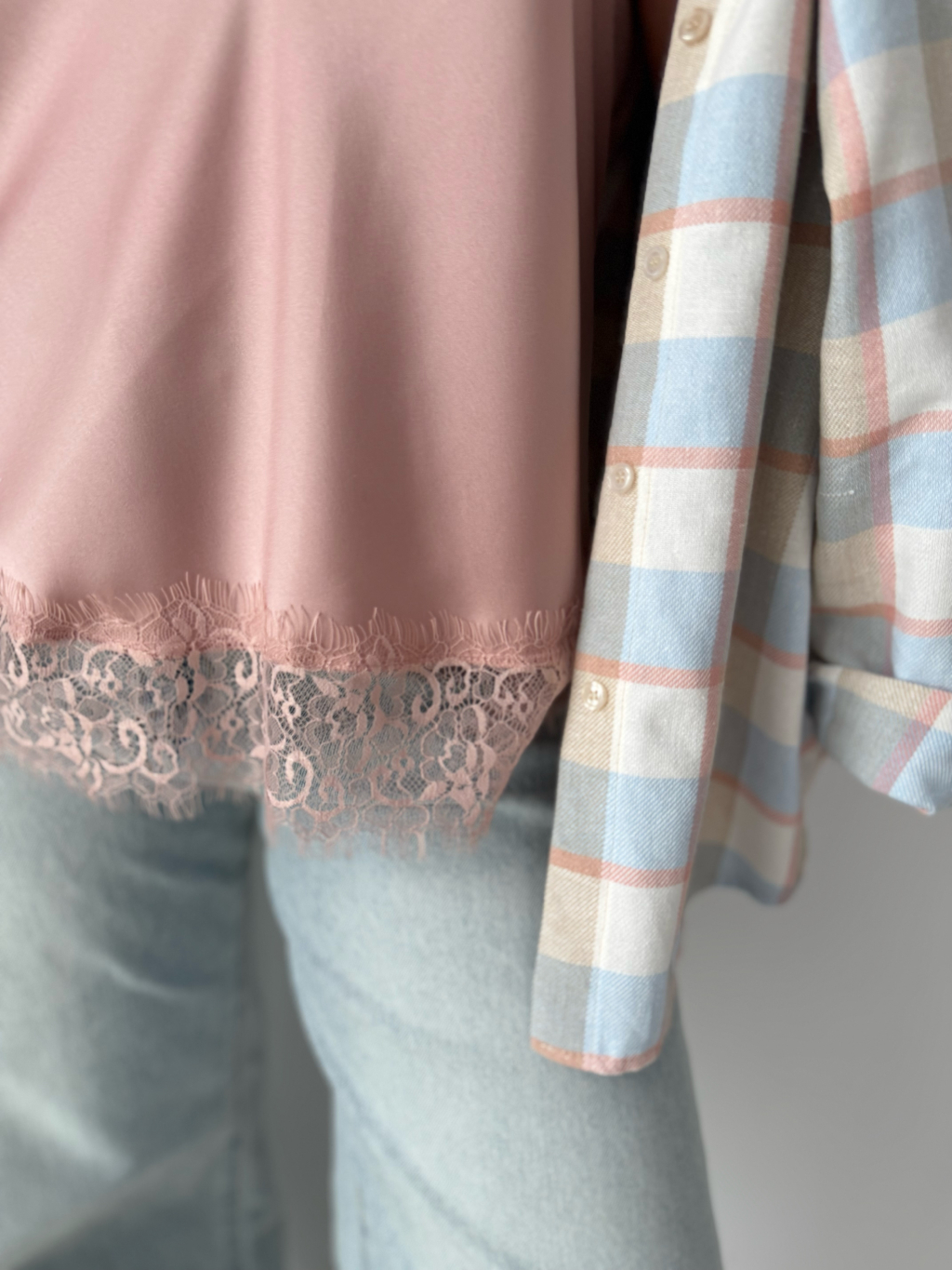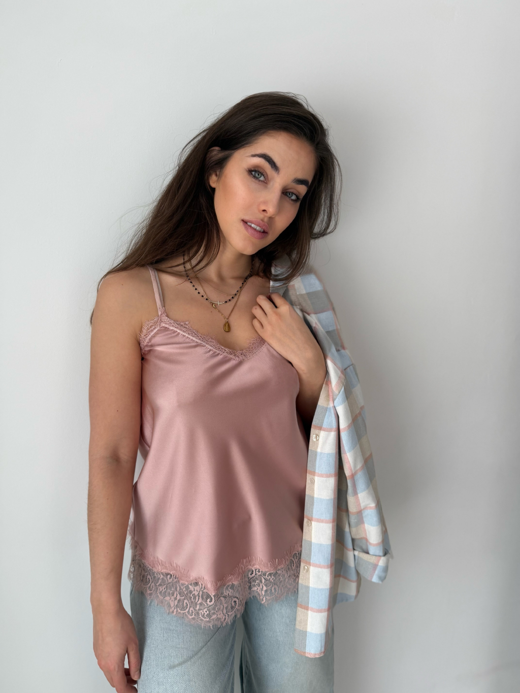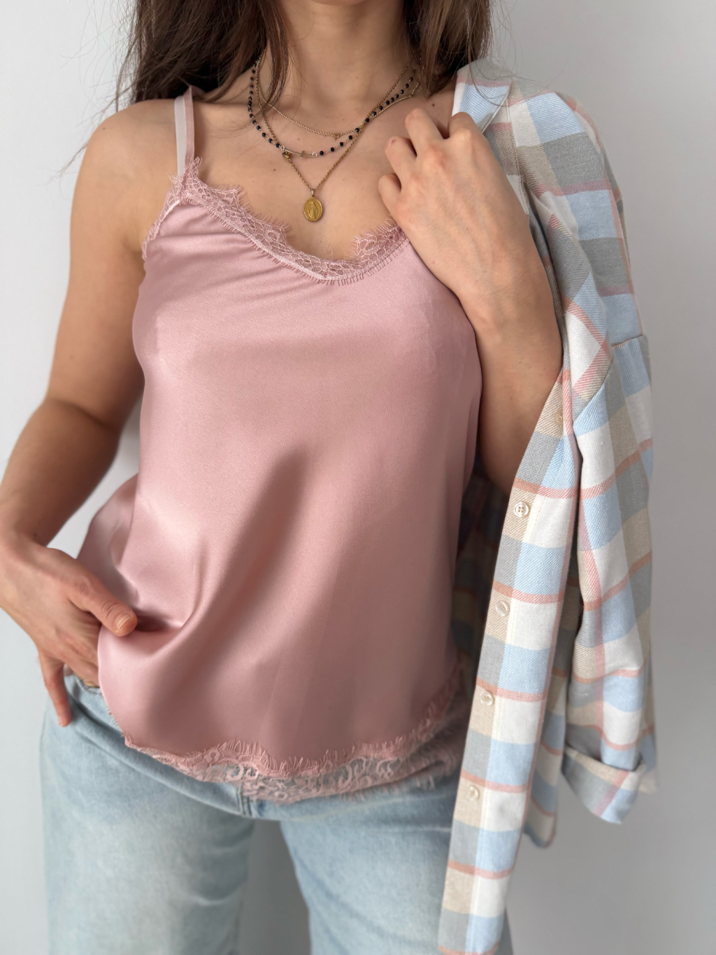 Saténové tílko s nastavitelnými ramínky. Krajka na horním i spodním okraji. Pružná guma na zádech.