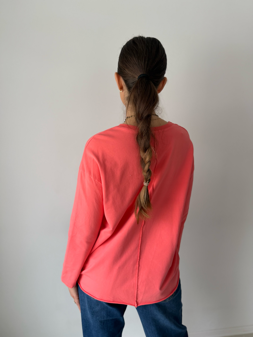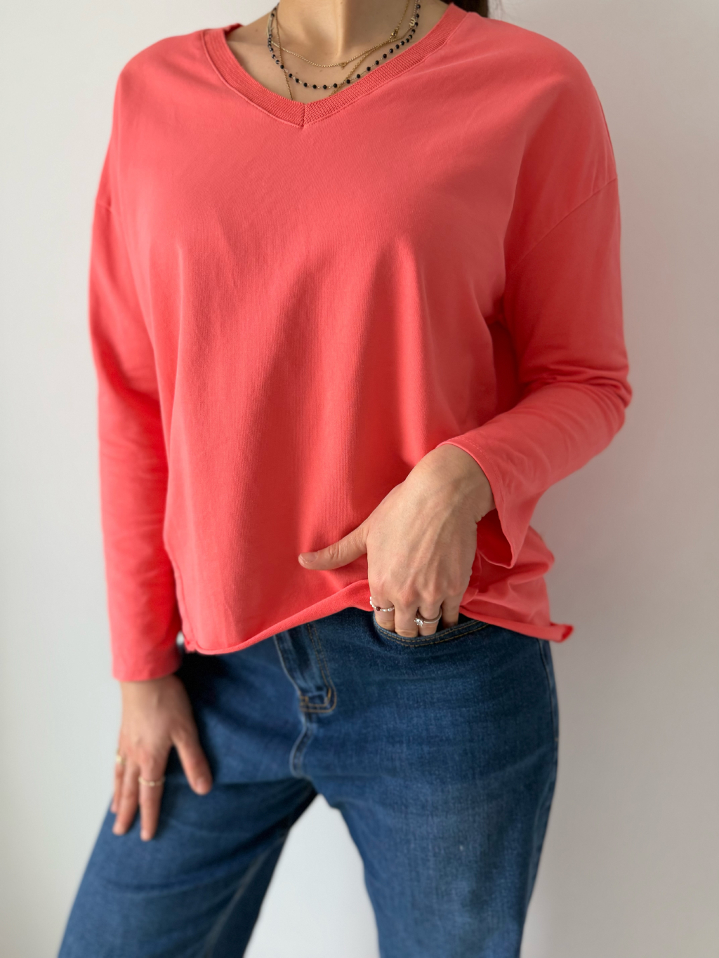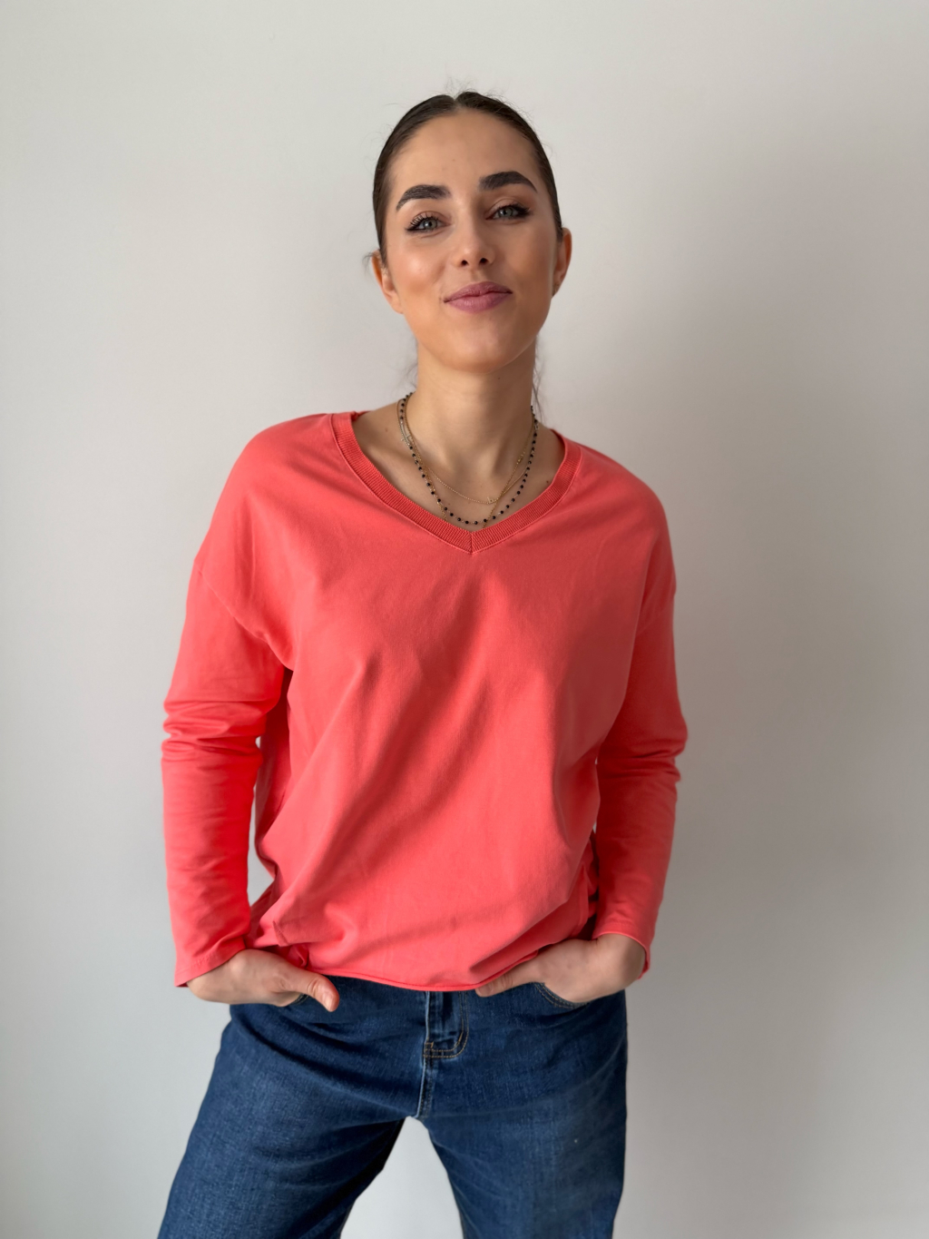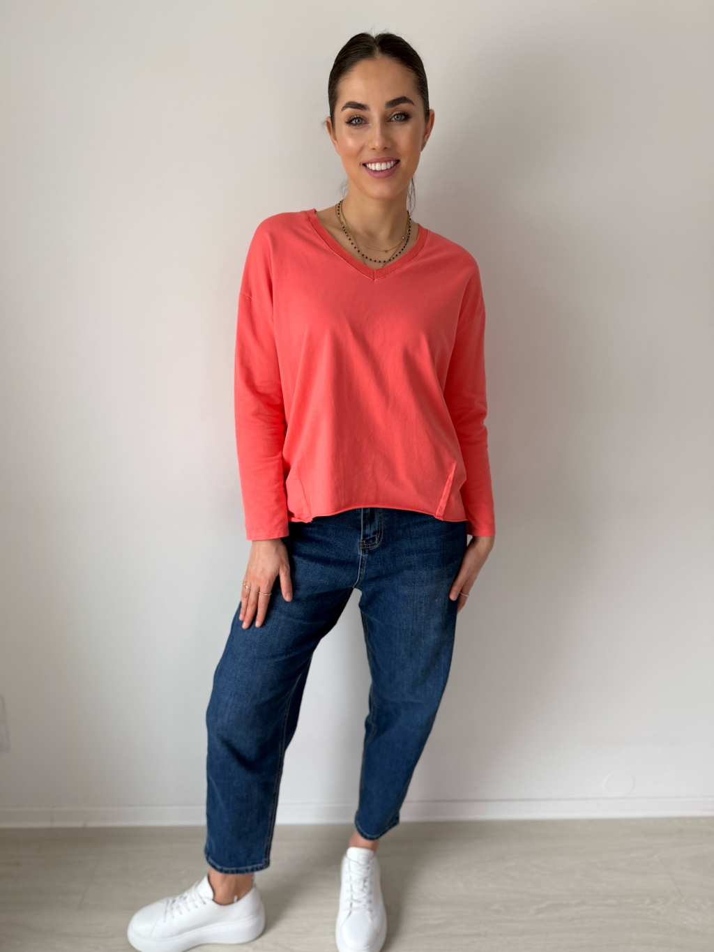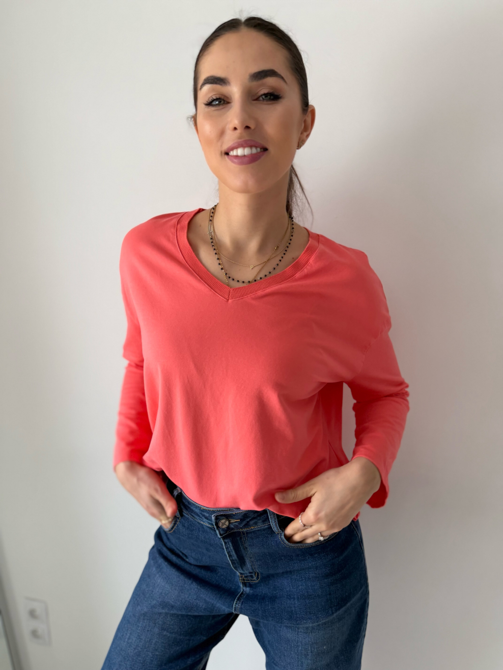Triko s výstřihem do V. Dlouhý rukáv. Zadní strana prodloužená. V přední spodní části dva trendy překlady, které jsou přišité.